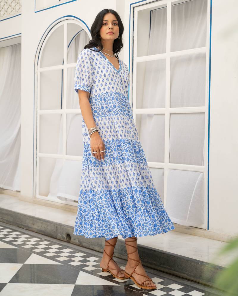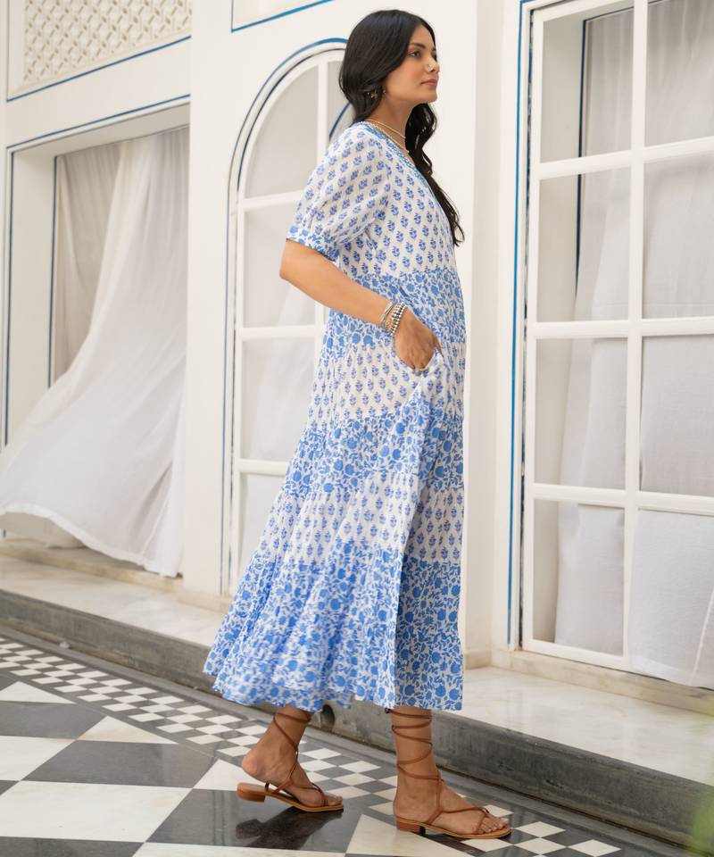 Blue white tiered printed pure cotton dress