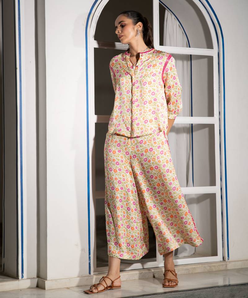 Light yellow floral embroidered satin co ord set stitched