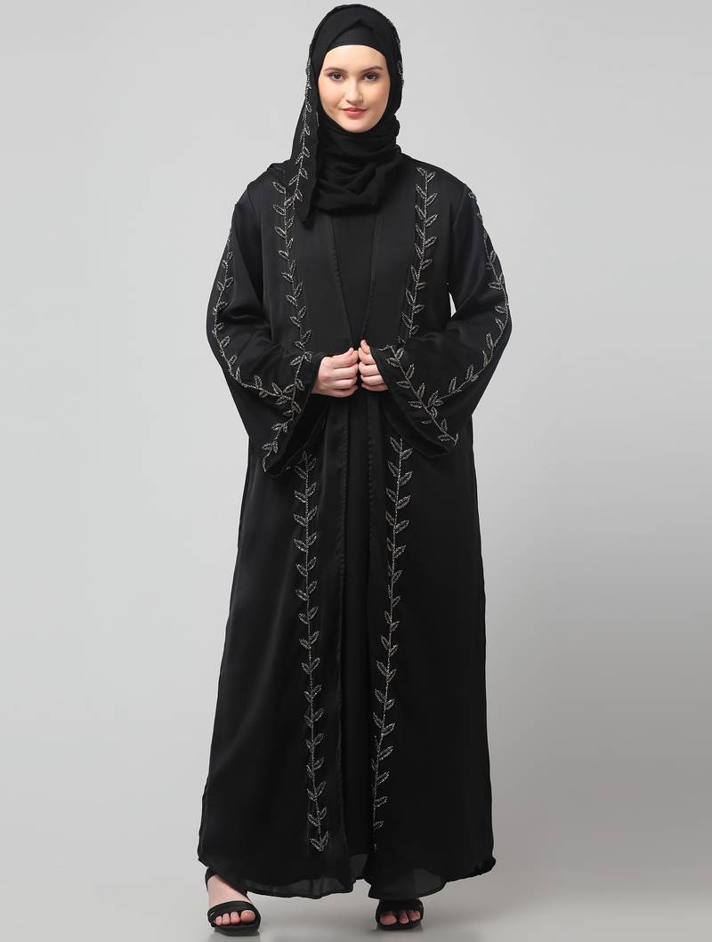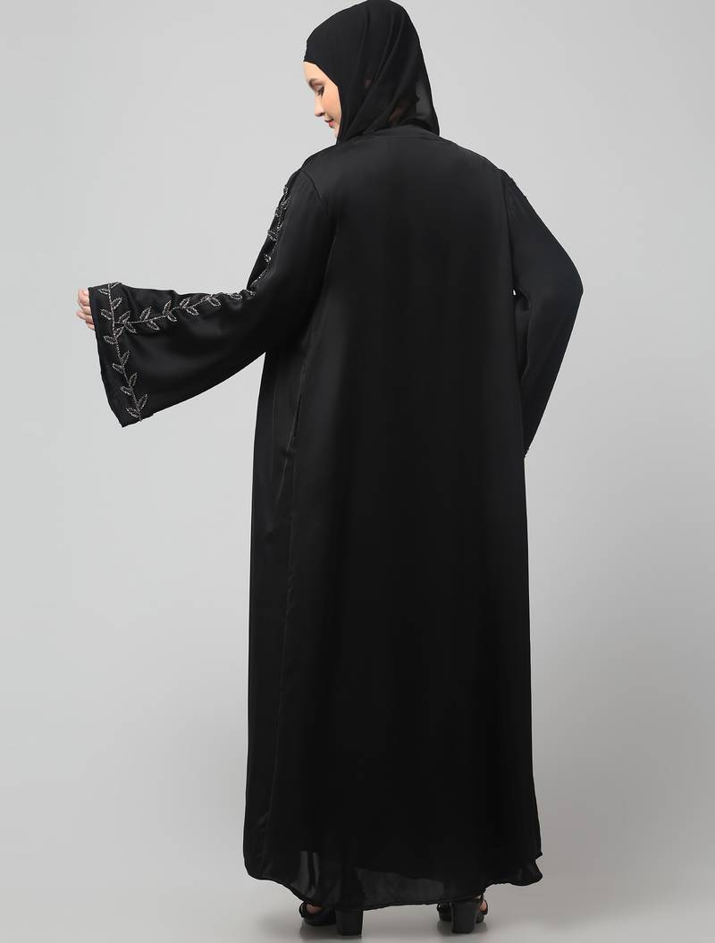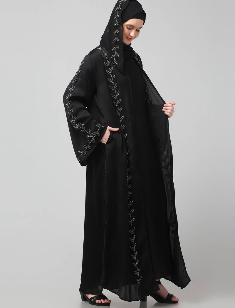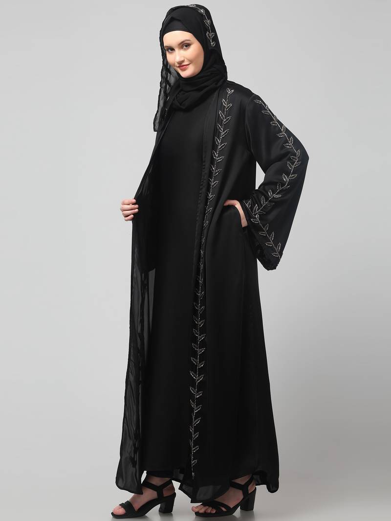 Both front shoulder to bottom , sleeves and hijab hand embroidered with inner cardigan style abaya with hijab