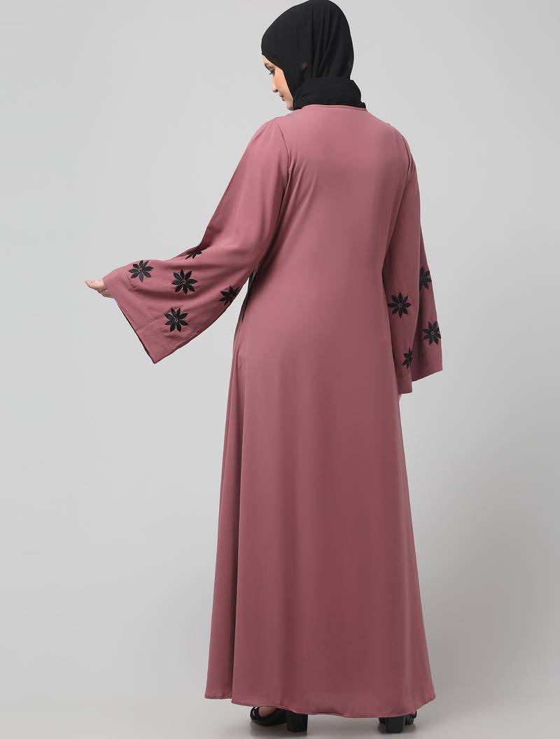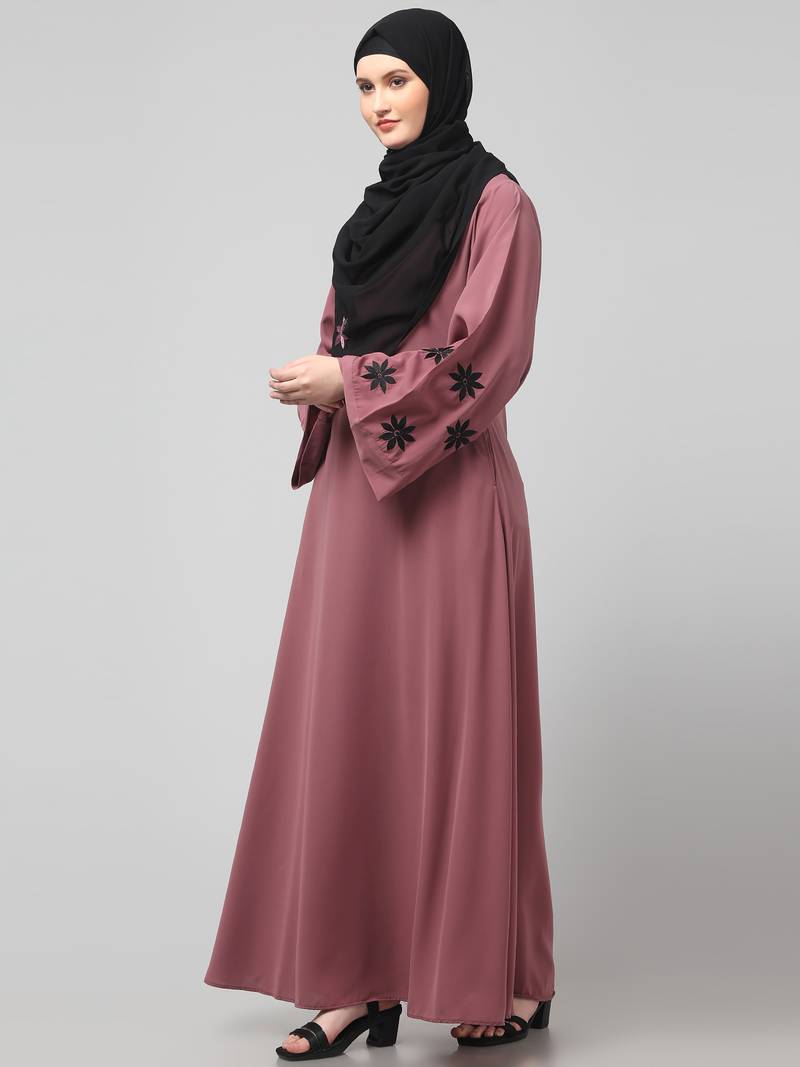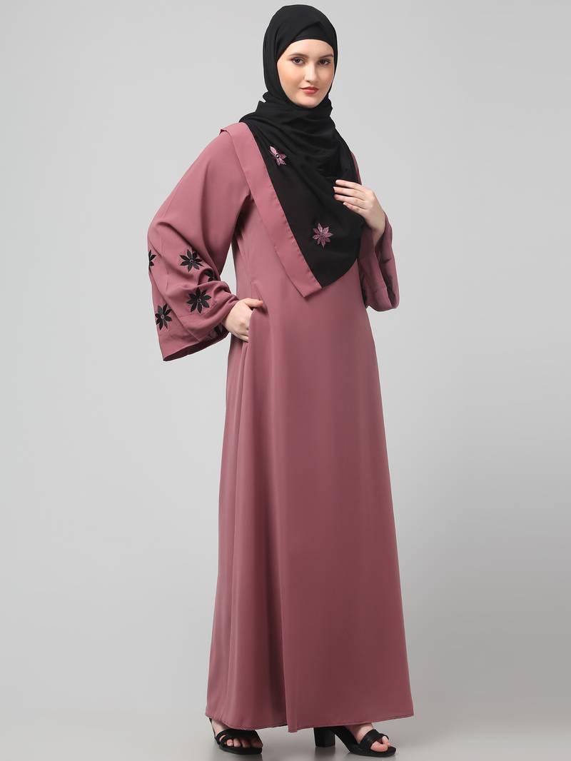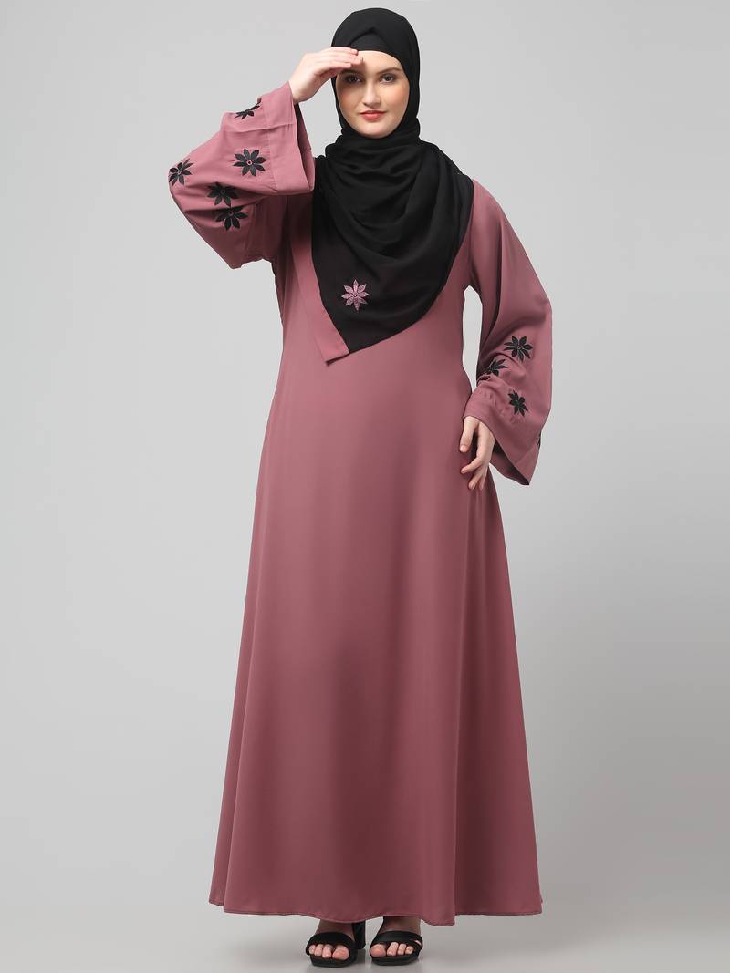 Flowers embboidery at sleeve and hijab a line flare at bottom abaya with hijab