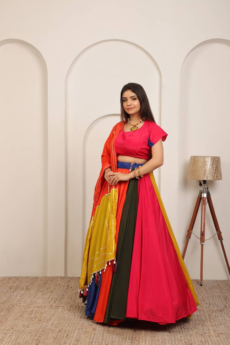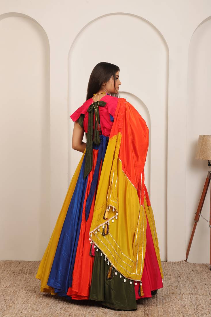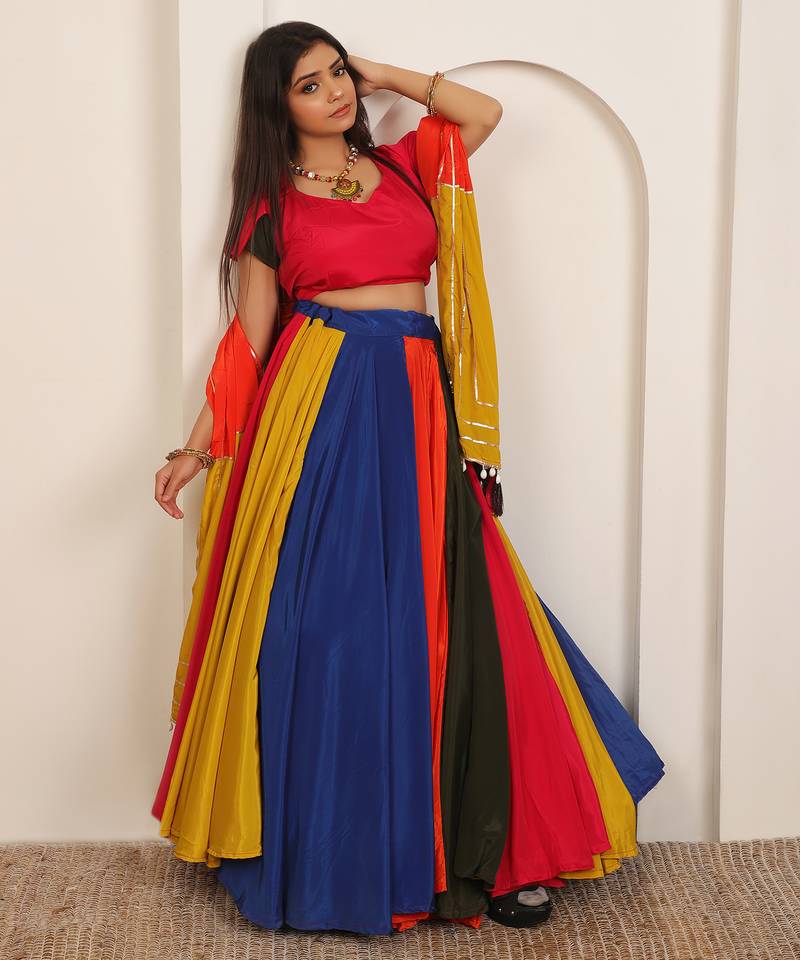 | Product Description | Vibrant Multi Color Lehenga Set Featuring A Striking Combination Of Yellow, Orange, Blue, And Pink For A Festive, Eye Catching Look Premium Fabric & Craftsmanship With Flowy Skirt, Contrast Blouse, And Beautifully Detailed Dupatta Accented With Shimmer Lines And Tassels Elegant Traditional Silhouette Designed To Offer Graceful Movement And A Flattering Fit For Celebrations Perfect For Festive & Wedding Occasions Ideal For Weddings, Haldi, Mehndi, Navratri, And Cultural Events Comfortable & Easy To Style Lightweight Construction That Pairs Effortlessly With Traditional Jewelry And Heels |