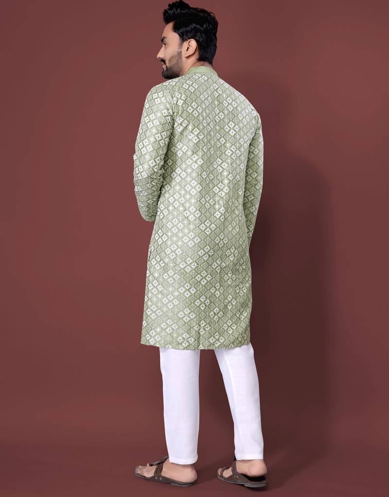 Olive sequence work soft silk straight kurta pyjama