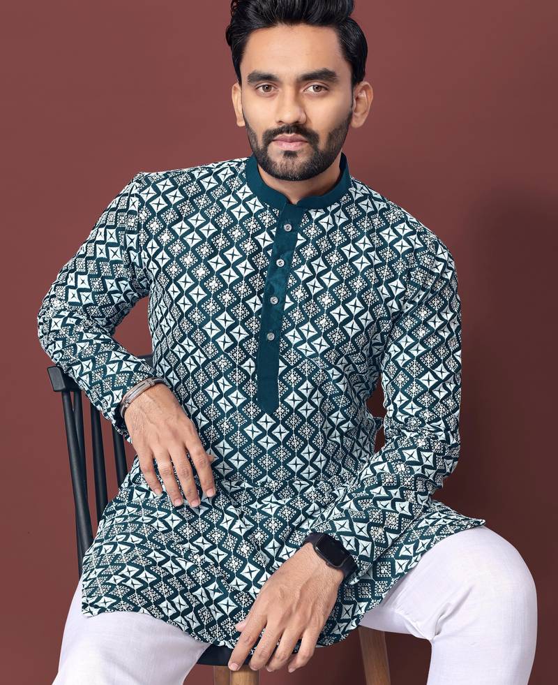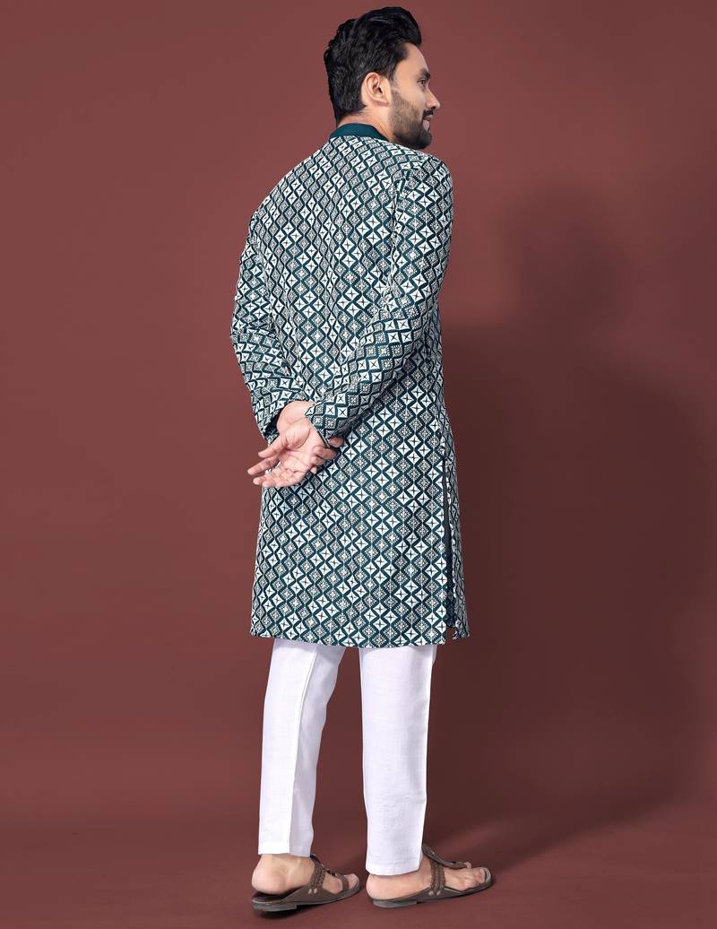 Teal sequence work soft silk straight kurta pyjama