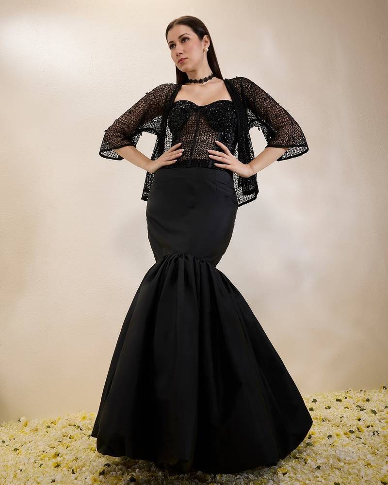| Product Description | Black Embroidered Corset Enhanced Wih Thread, Sequins, Bead And Stone Work. It Is Teamed With A Jaali Embroidered Jacket And Balloon Skirt