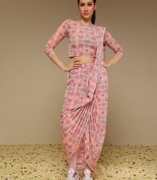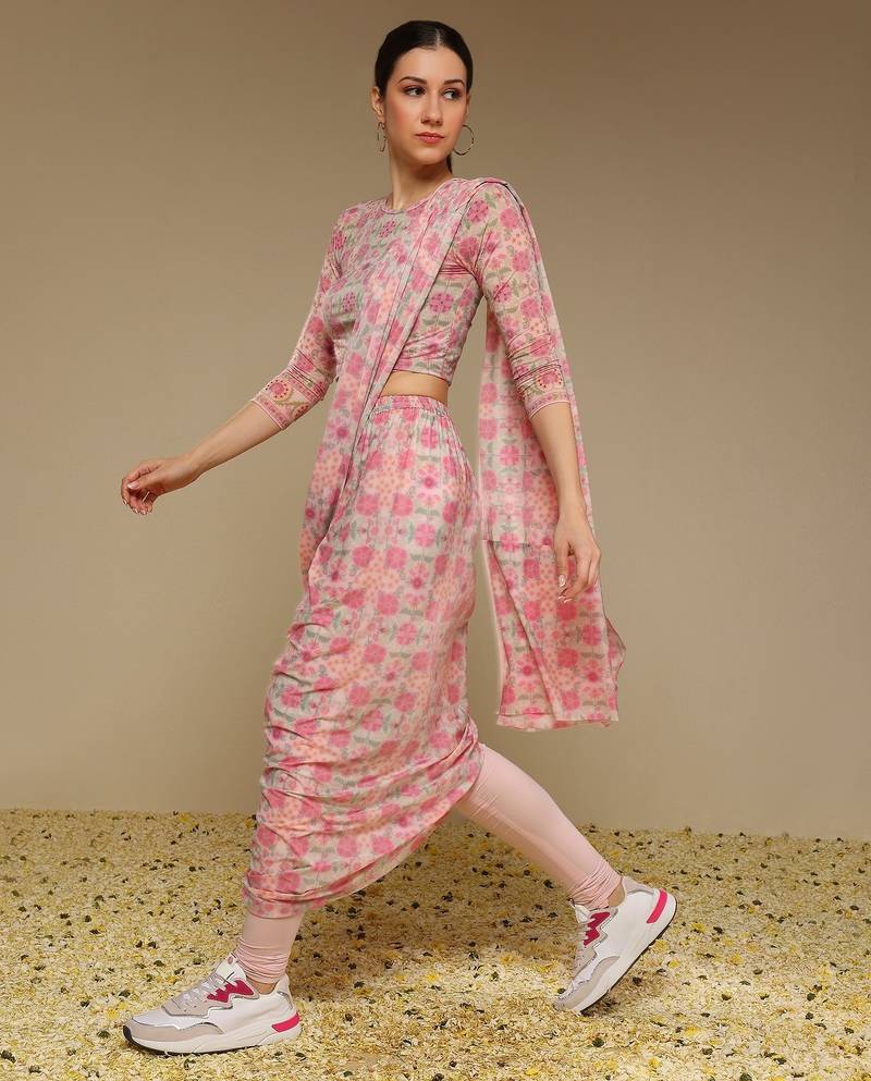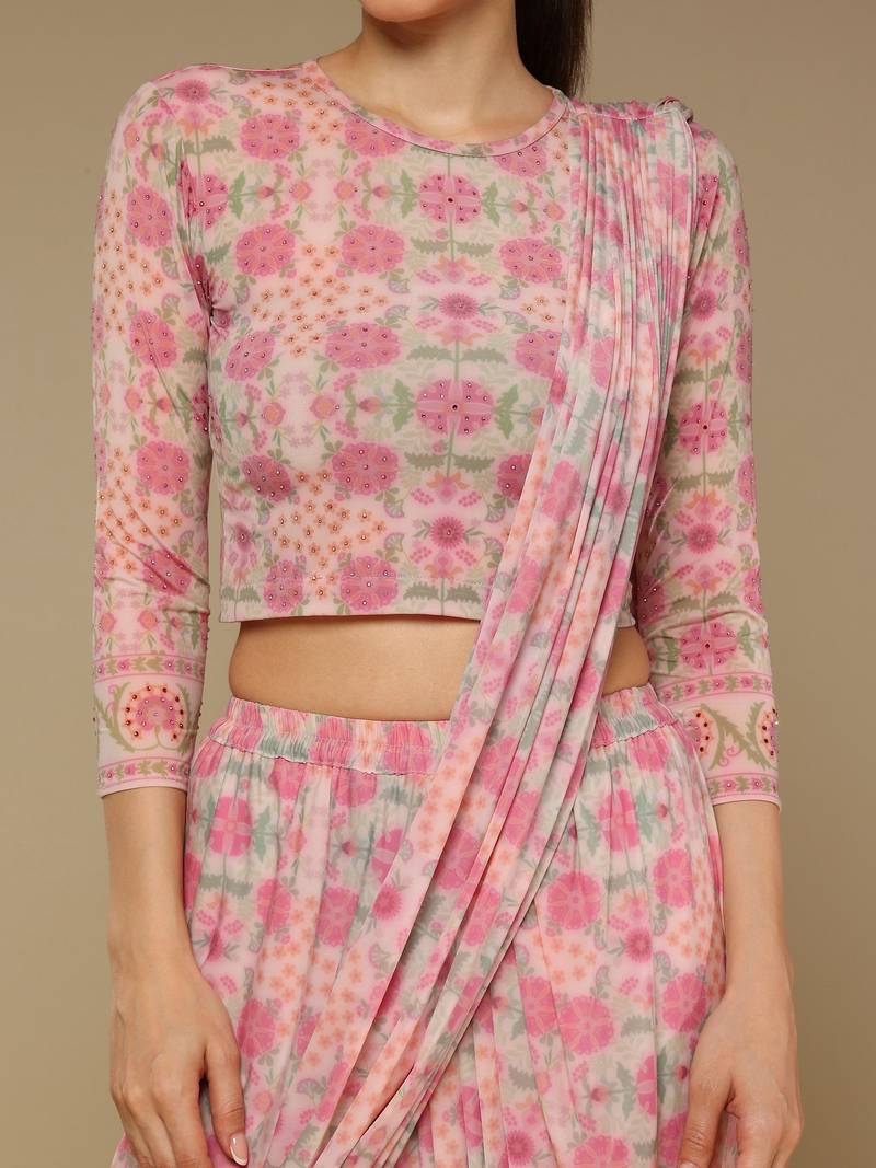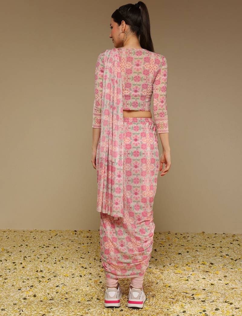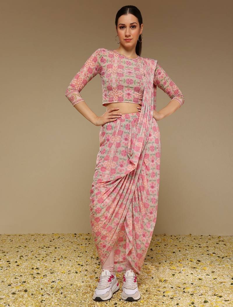 Pink floral printed lycra fusion saree
