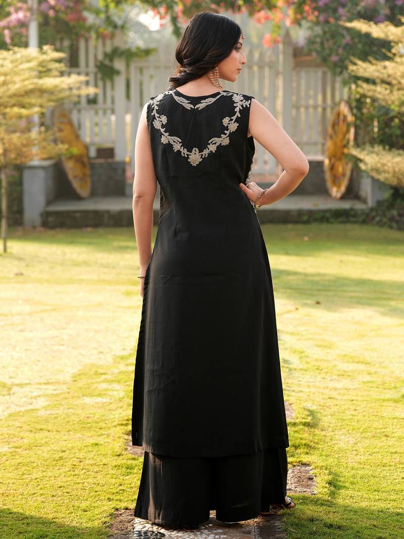 | Product Description | Sleeveless Black Art Silk Kurta With Intricate Silver/Gold Embroidery Around The Front And Back Neckline With Cut Out Detailing. |