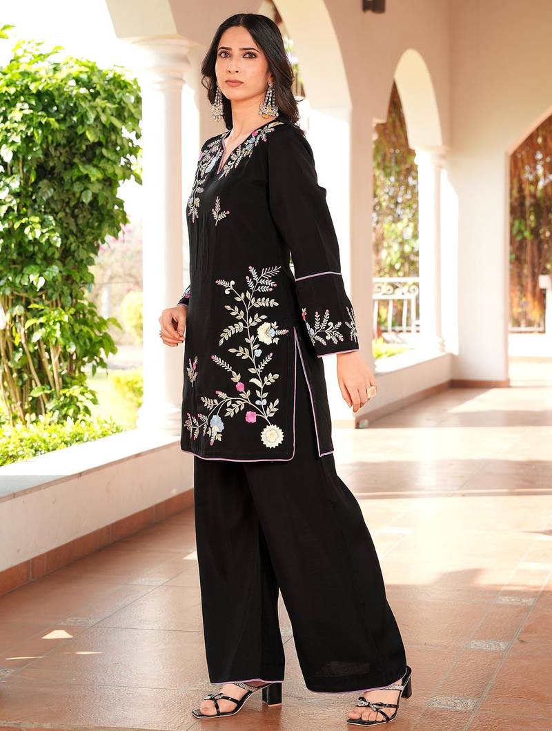 | Product Description | Black Art Silk Straight Cut Tunic With Floral Embroidery In Pink, Blue, And Gold On The Neckline, Front Panel, And Bell Sleeves. The Embroidery Has Delicate Leaf And Flower Motifs, And The Sleeves Have Pink Piped Edges. |