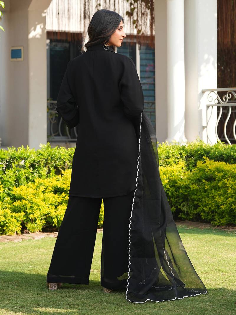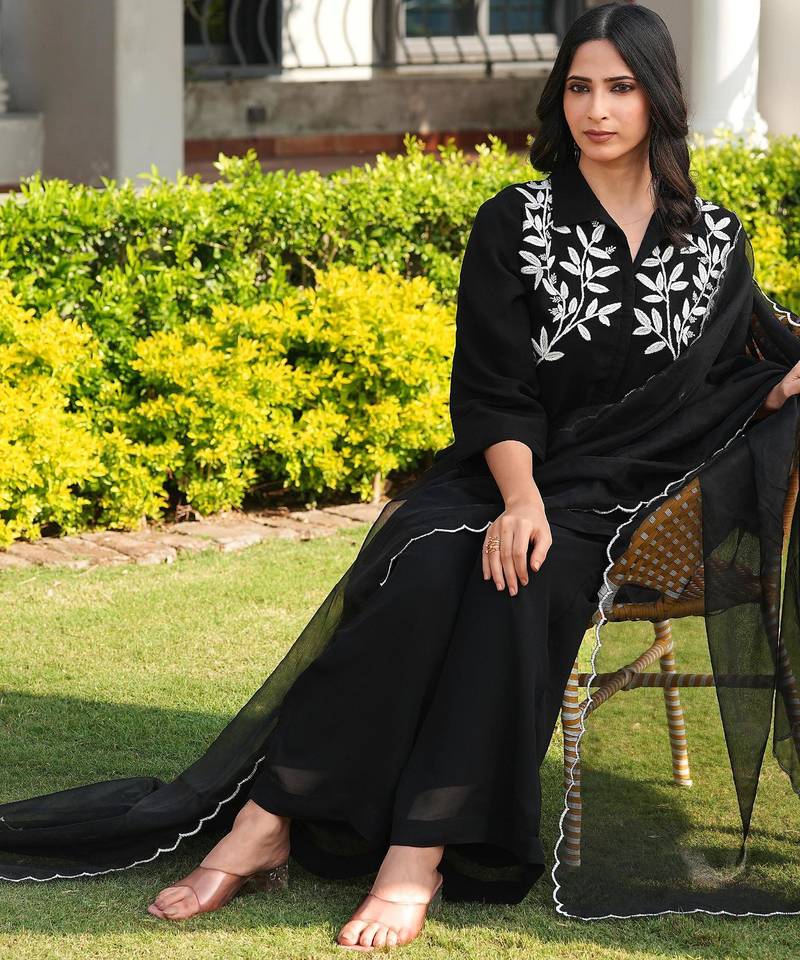 | Product Description | Black Viscose Georgette Kurta Style Shirt With White Embroidered Floral Vines On The Neckline And Chest Area.Paired With Black Pants And Black Sheer Organza Dupatta With Scalloped White Embroidered Edges. |