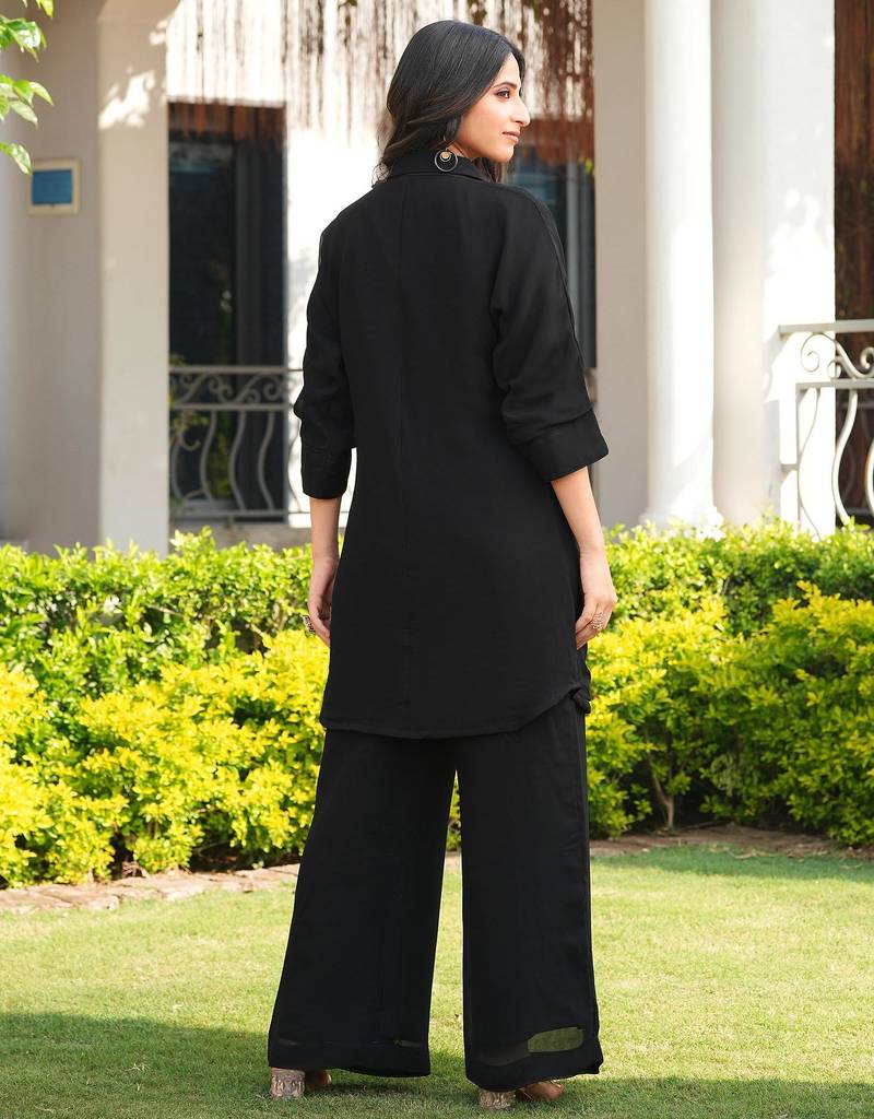 | Product Description | Black Viscose Georgette Kurta Style Shirt With White Embroidered Floral Vines On The Neckline And Chest Area. |