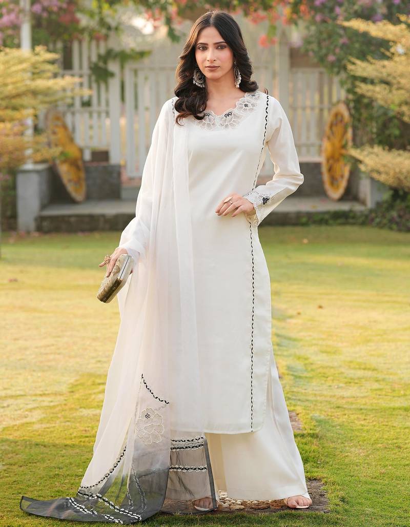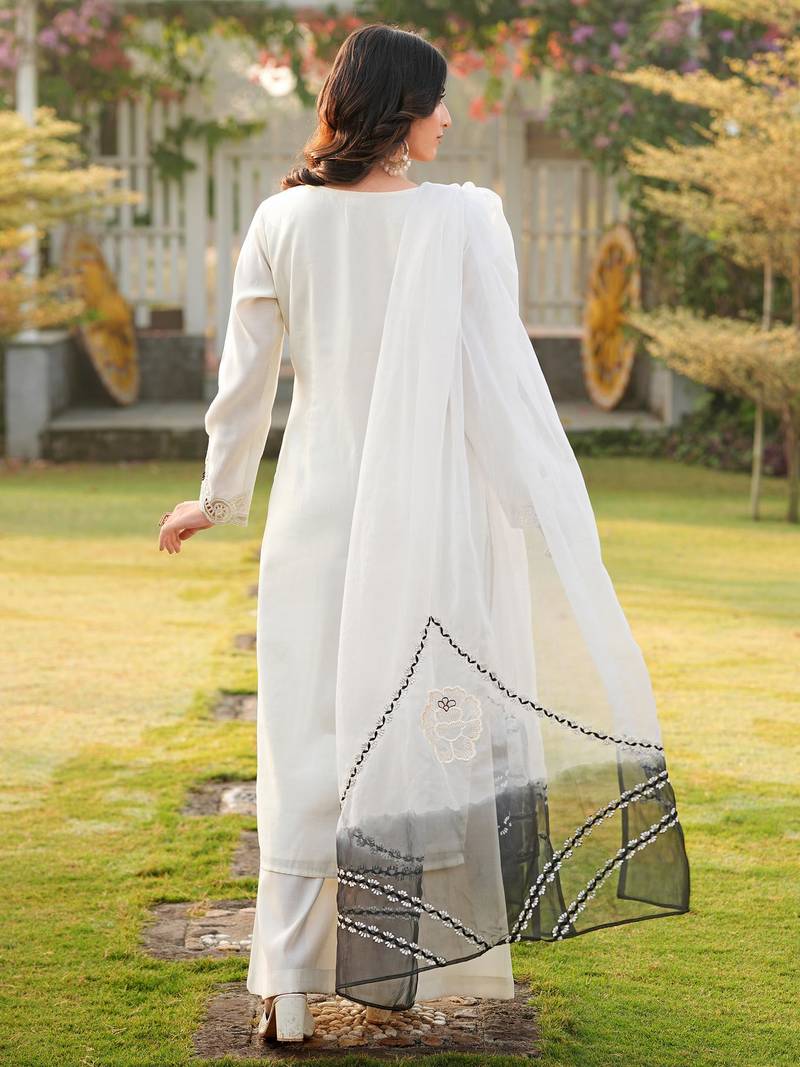 | Product Description | Cream Art Silk Kurta With Embroidery On Neckline, Sleeves And Kalis, Paired . With Cream Culottes And A Cream Dupatta That Has A Black Ombre Effect At The Bottom. The Dupatta Features Floral Lace Embroidery And Black Trim Along The Edges. |