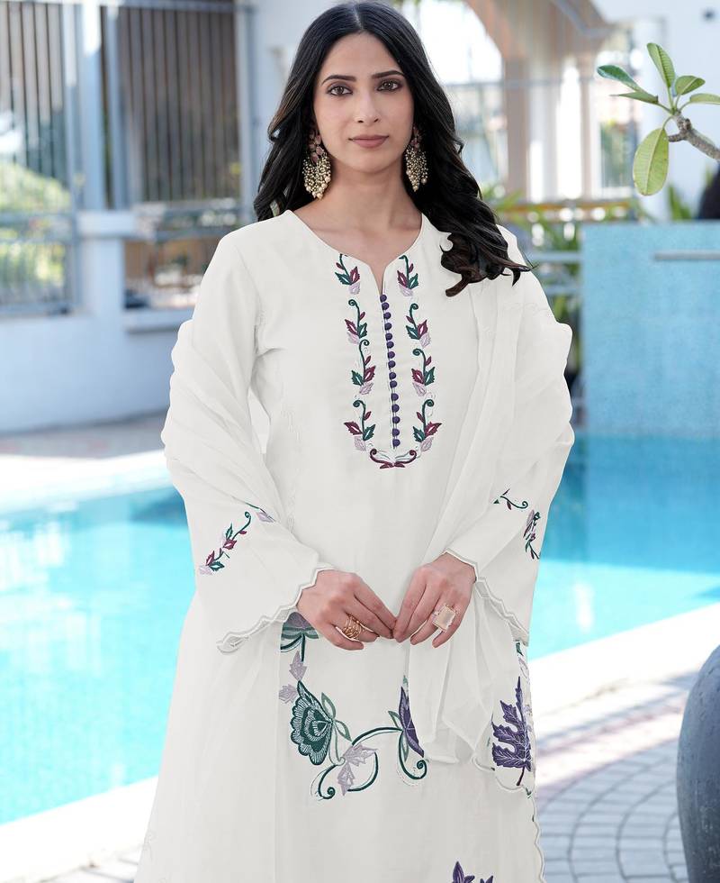 | Product Description | Cream Art Silk Three Piece Suit With Embroidered Floral Motifs In Pink, Purple, And Green On The Neckline And Sleeves. It Is Paired With Matching Straight Pants And A Sheer Organza Dupatta Featuring Embroidered Purple And Pink Leaf Designs Along The Borders, Finished With Scalloped Edges. |