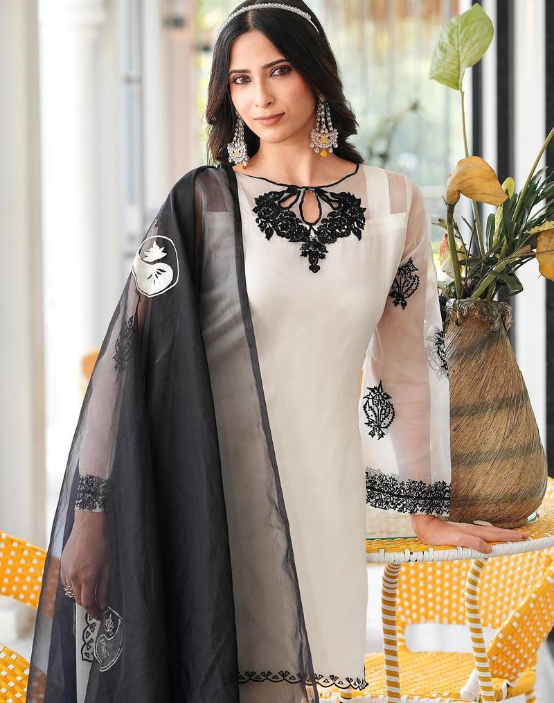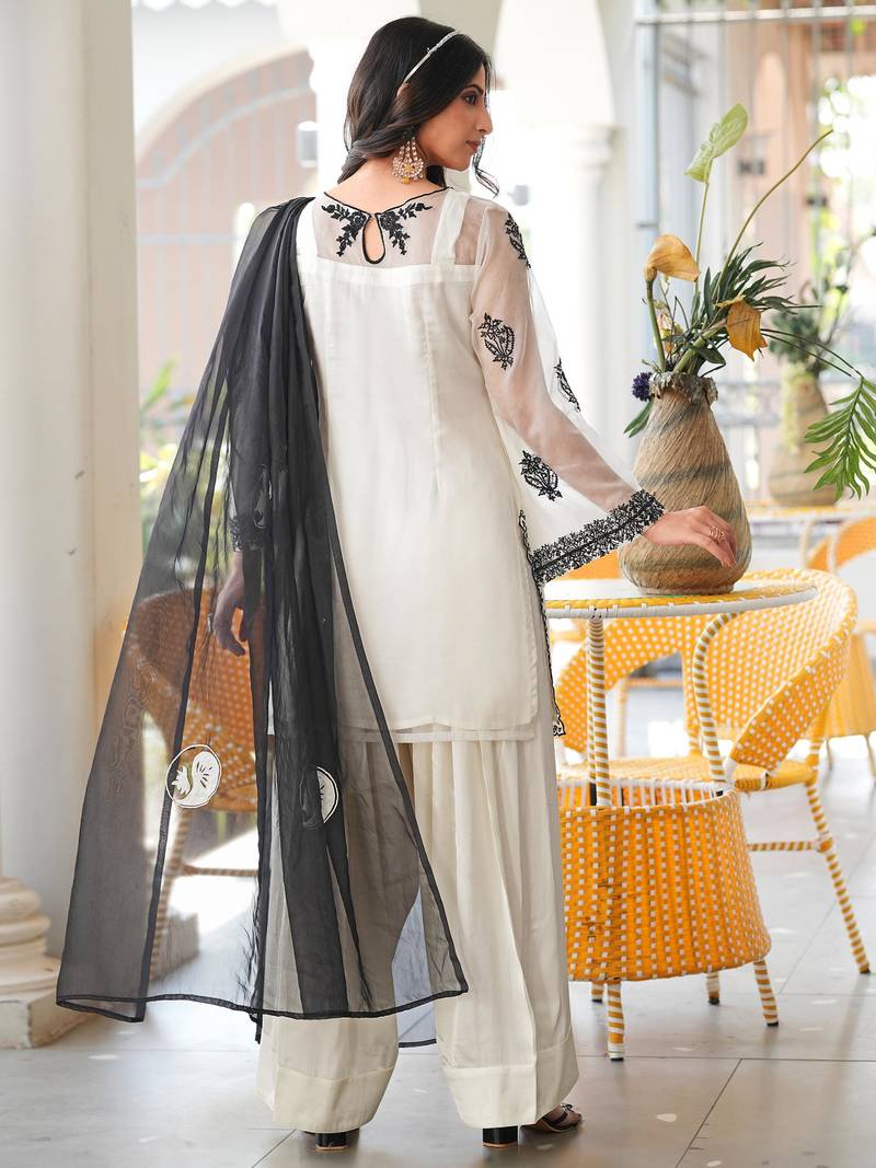 | Product Description | Cream Organza Tunic With Black Lace Embroidery Around The Neckline, Cuffs, And Hem. White Farshi Salwar With A Black Lace Border Near The Bottom. Black Sheer Organza Dupatta With Lace Detailing On The Edges And A White Yin Yang Emblems All Over. |