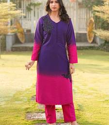| Product Description | Dark Purple To Pink Ombre Art Silk Kurta With Black Embroidered Ehand Embroidery On The Neckline And Lower Front Panel, Paired With Pink Pants. |