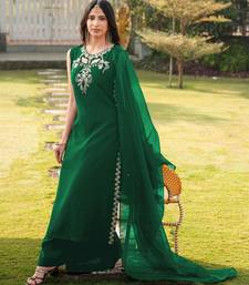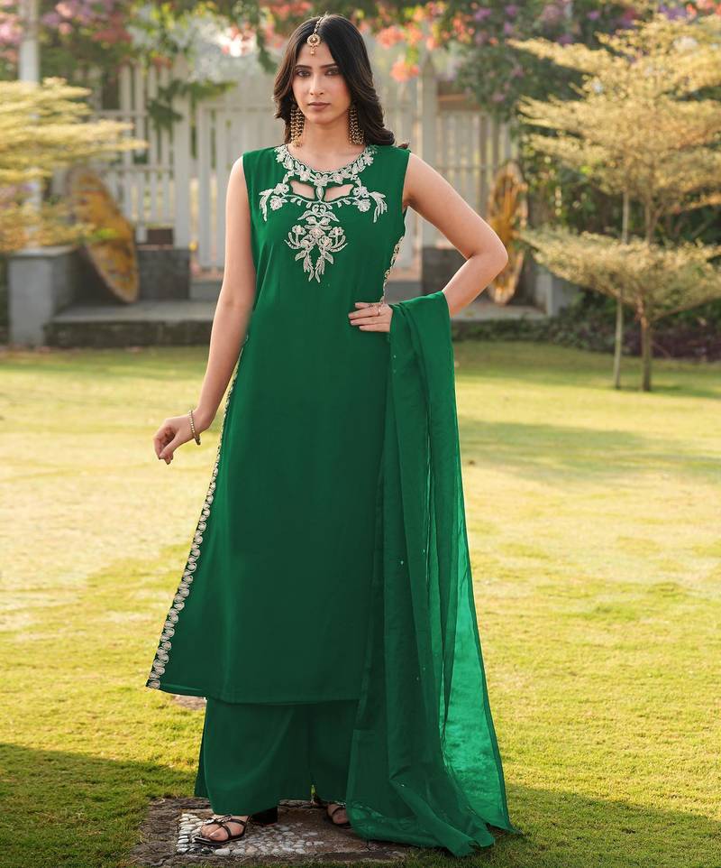 Green embroidered art silk stitched a line kurta palazzo dupatta readymade suits