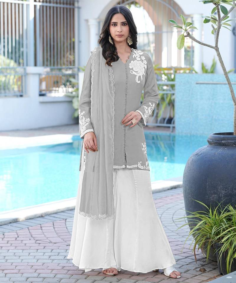 | Product Name | Grey Hand Embroidery Modal Satin Stitched Straight Cut Kurta Kalidar Palazzo Dupatta Readymade Suits | |