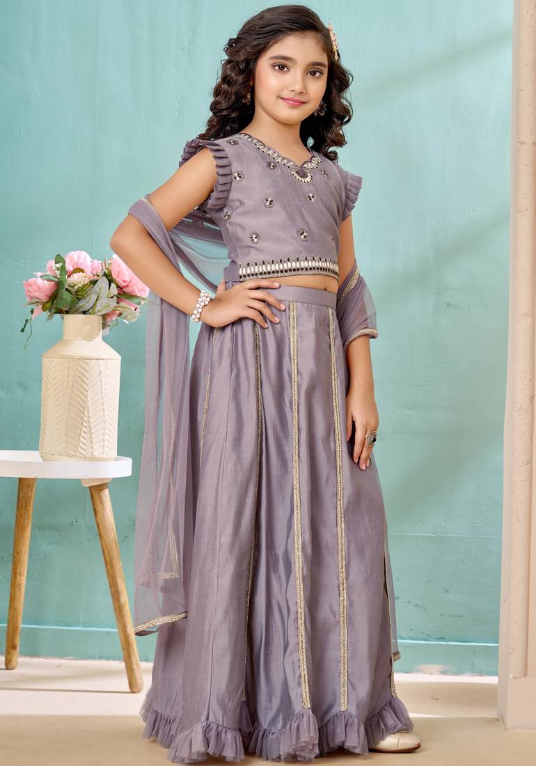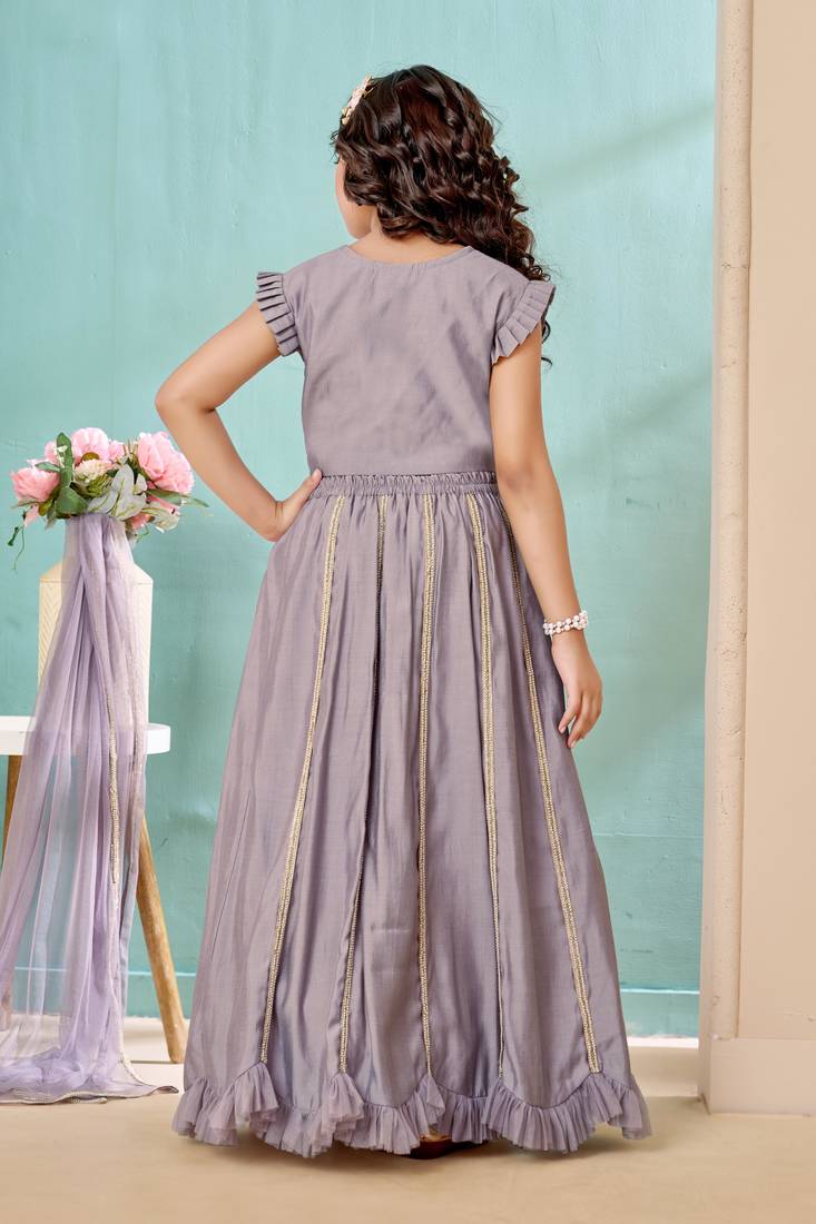 | Product Description | Grey Short Top With Cap Sleeves Decorated With Resham Embroidery And Floral Embroidered Motifs Around The Neckline And Scattered On The Fabric. The Hem Has Embroidery Too.The Lehenga Is A Grey Skirt With Gold And Pearl Lace Panels Running Vertically And A Ruffled Net Overlay At The Bottom, Finished With Gold Trim. A Matching Net Dupatta With Gold Border. |