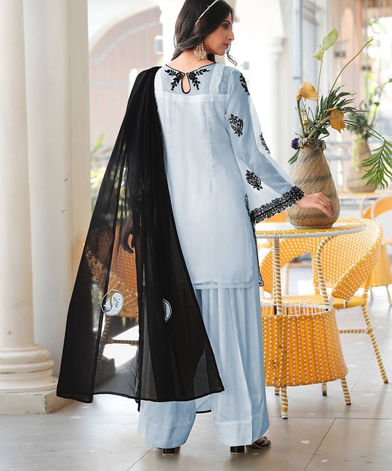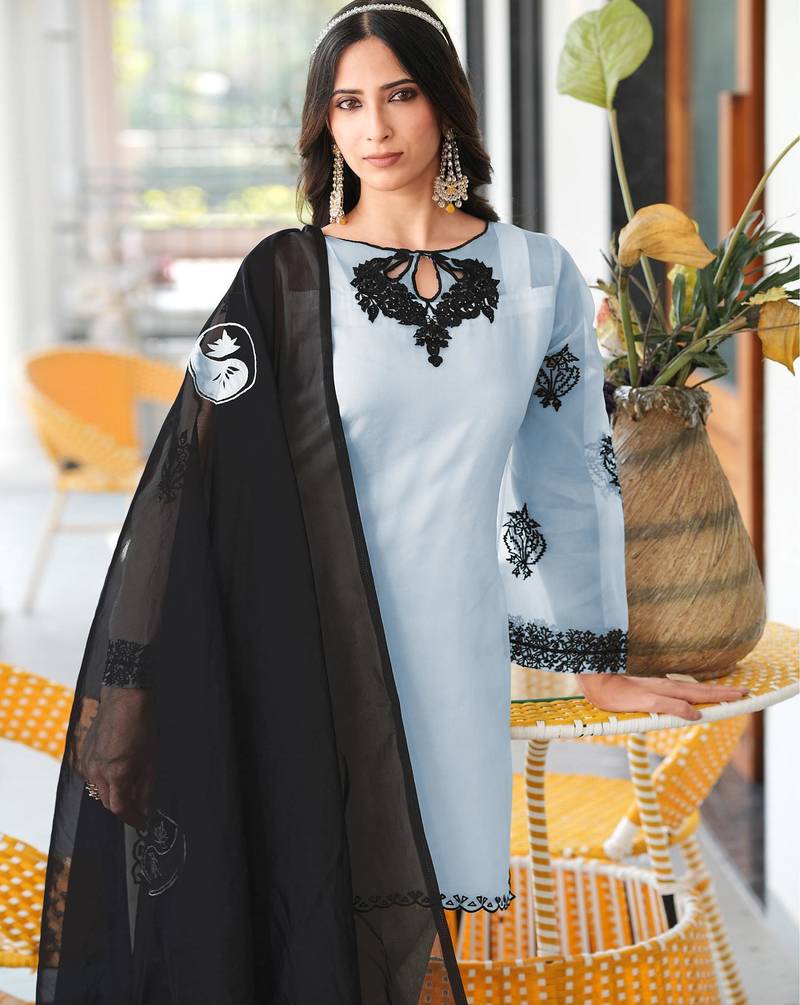 Light-blue embroidered organza stitched straight cut kurta farshi salwar dupatta readymade suits