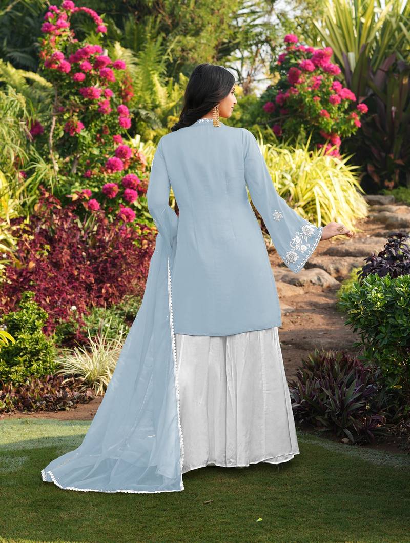 Light-blue hand embroidery modal satin stitched straight cut kurta kalidar palazzo dupatta readymade suits
