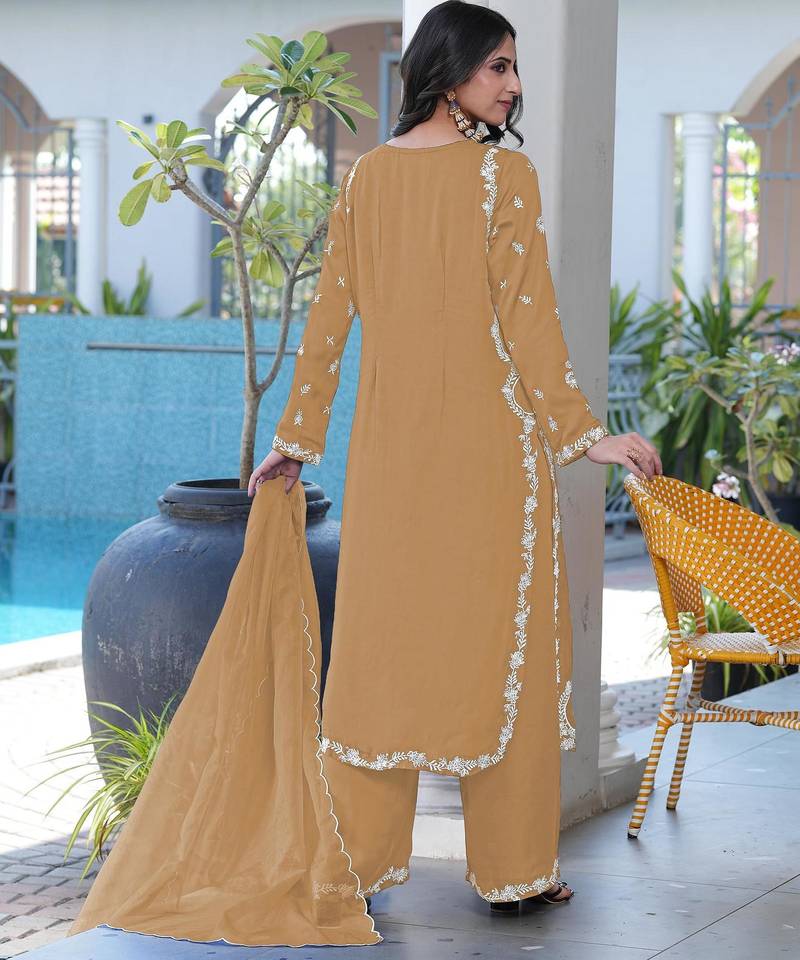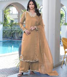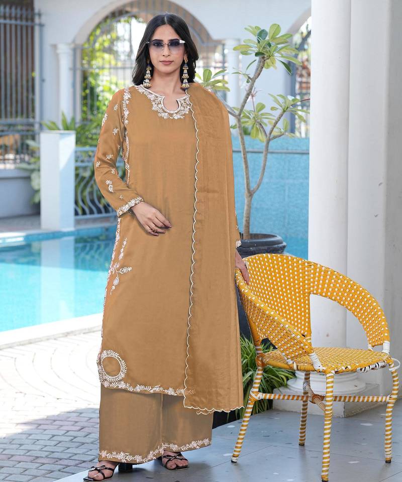 | Product Name | Light Brown Embroidered Modal Satin Stitched Straight Cut Kurta Culottes Dupatta Readymade Suits | |