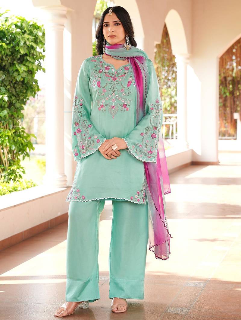 | Product Name | Light Green Hand Embroidery Modal Satin Stitched Straight Cut Kurta Farshi Salwar Dupatta Readymade Suits | |