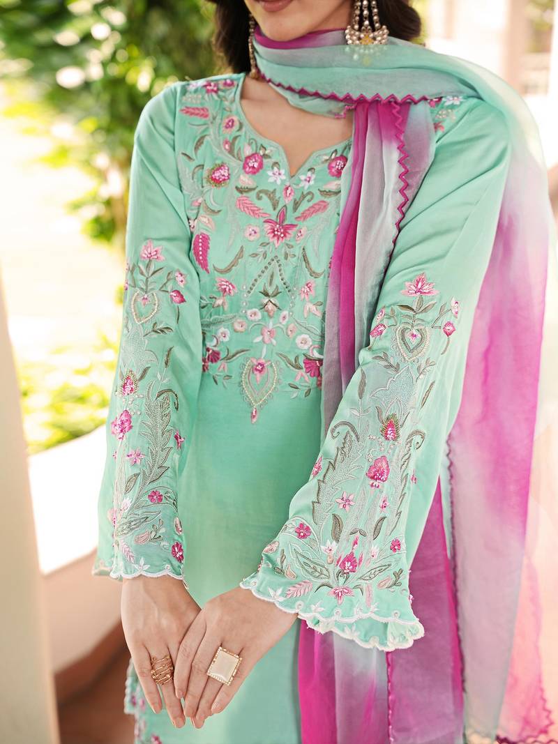 | Product Description | Mint‑Green Modal Satin Kurta With Pink And White Floral Embroidery On The Yoke And Sleeves, Paired With Matching Green Farshi Salwar. Paired With A Sheer Pink‑Gradient Dupatta That Has Pink Scalloped Edges. |