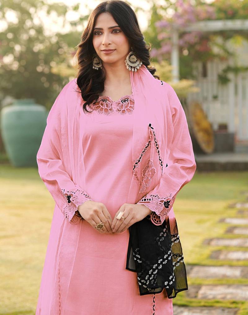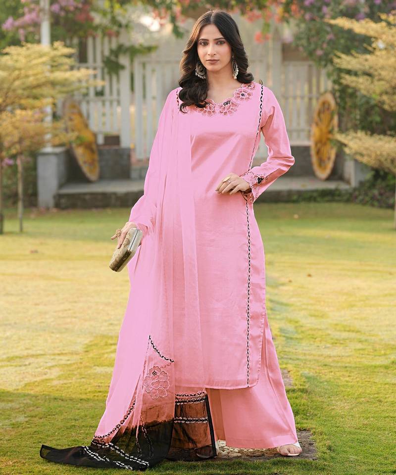 | Product Name | Light Pink Embroidered Art Silk Stitched Straight Cut Kurta Palazzo Dupatta Readymade Suits | |