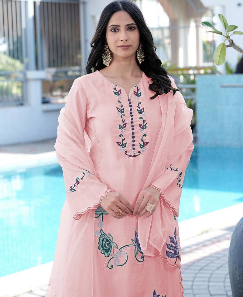 | Product Description | Light Pink Art Silk Three Piece Suit With Embroidered Floral Motifs In Pink, Purple, And Green On The Neckline And Sleeves. It Is Paired With Matching Straight Pants And A Sheer Organza Dupatta Featuring Embroidered Purple And Pink Leaf Designs Along The Borders, Finished With Scalloped Edges. |
