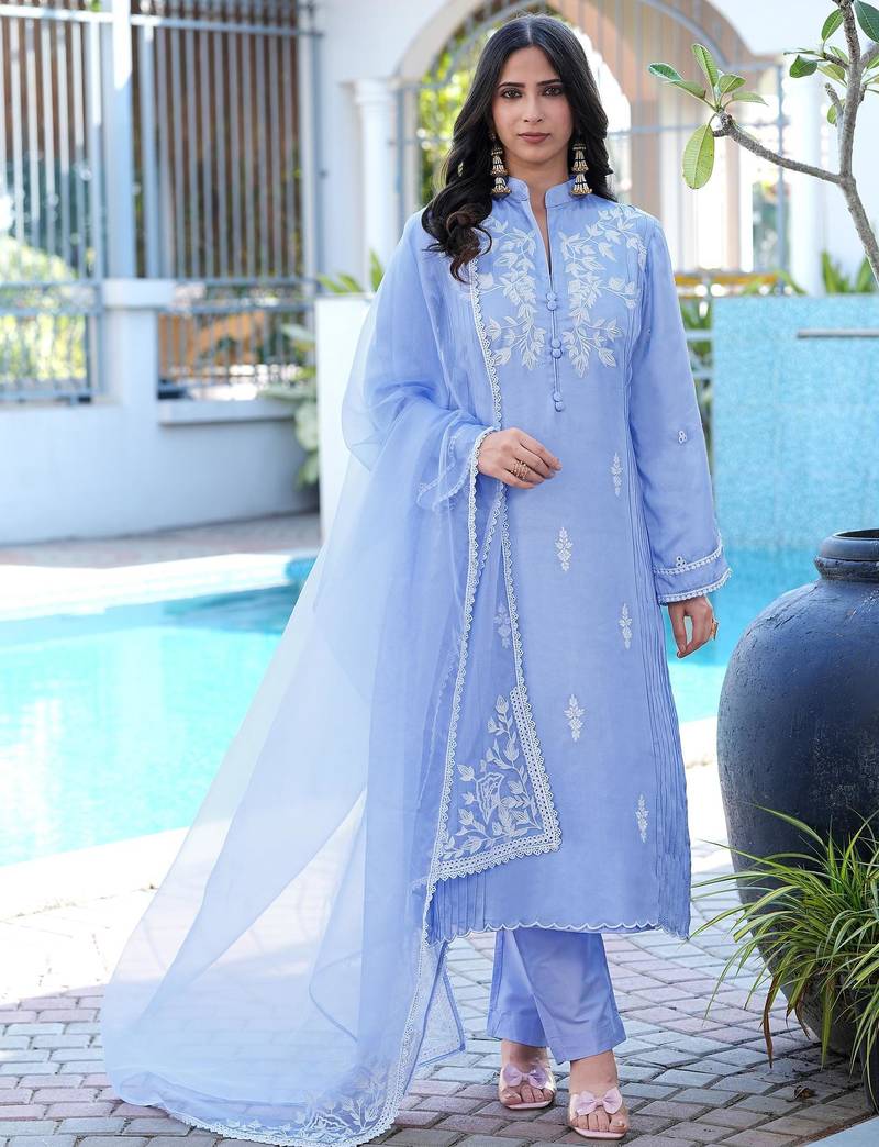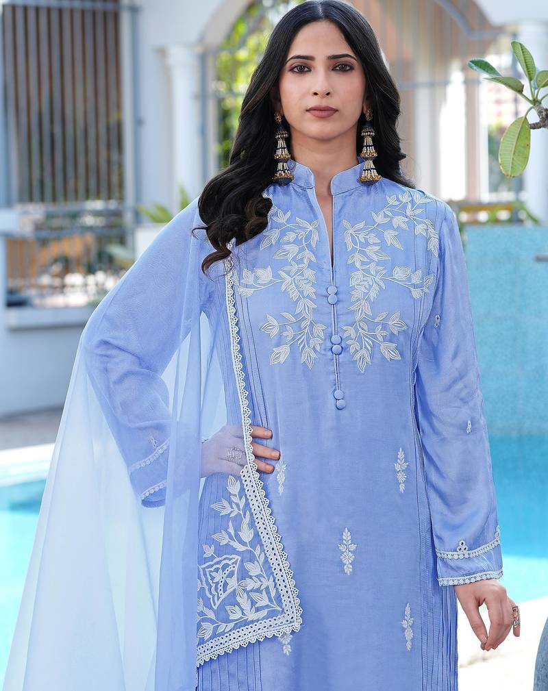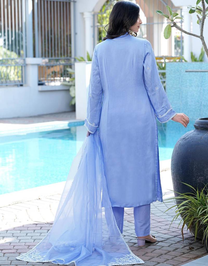 | Product Description | Light Blue Modal Satin Straight Cut Kurta With White Embroidered Floral Motifs On The Front Panel And Scattered Small Embroidered Motifs On The Lower Portion. The Kurta Has Button Detailing At The Neckline And Lace Trim On The Sleeves And Hem. Worn With Matching Light Blue Cigarette Pants And Light Blue Organza Dupatta With White Embroidered Floral Patterns And Scalloped Lace Edges. |