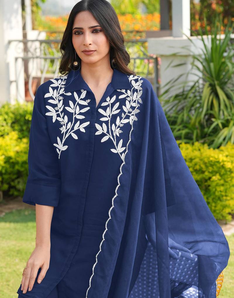 | Product Name | Navy Blue Embroidered Viscose Georgette Stitched Straight Cut Kurta Culottes Dupatta Readymade Suits | |