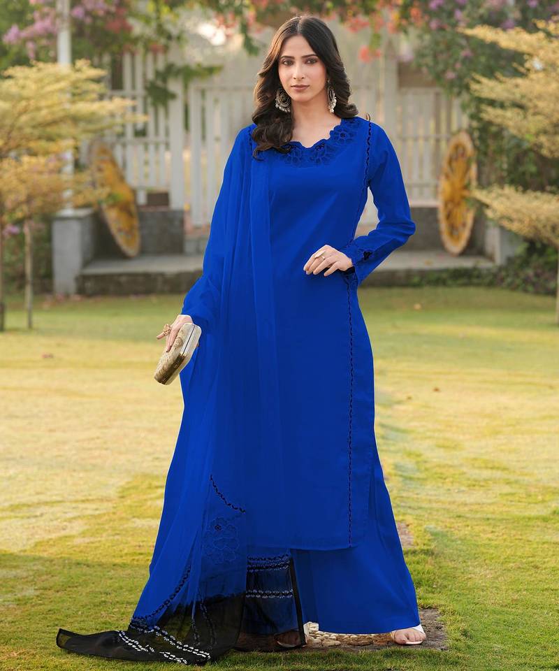 Royal-blue embroidered art silk stitched straight cut kurta palazzo dupatta readymade suits