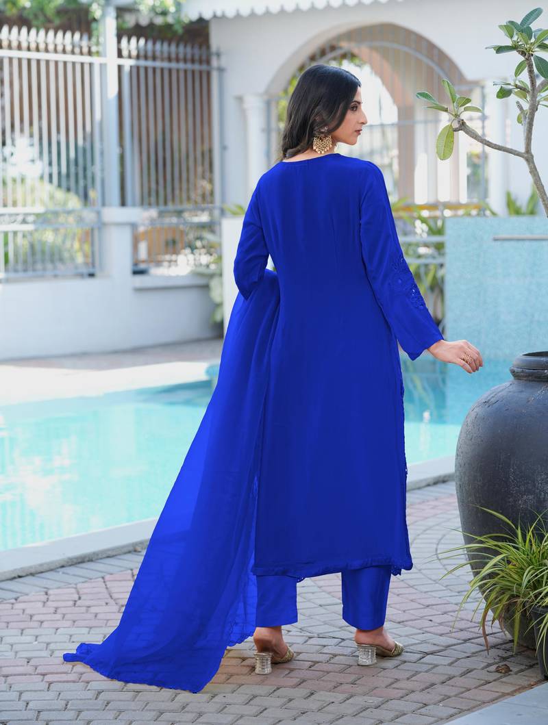 Product Name Royal Blue Embroidered Art Silk Stitched Straight Cut Kurta Pants Dupatta Readymade Suits