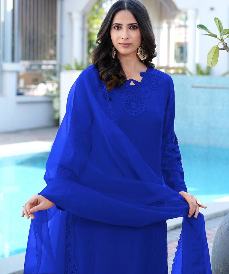 Royal Blue Art Silk Kurta With Intricate Cutwork Embroidery On The Neckline, Sleeves, And Hem, And Scalloped Lace Detailing Along The Front Slit. Matching Royal Blue Pants That Are Straight Cut And Reach The Ankles. Paired With Royal Blue Dupatta With Embroidered Floral Motifs And Scalloped Edges, Draped Over Left Shoulder.