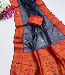 Blue color tissue art silk saree with contrast blouse