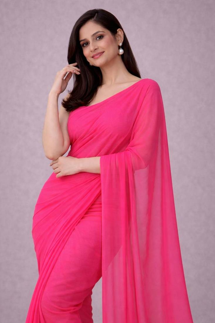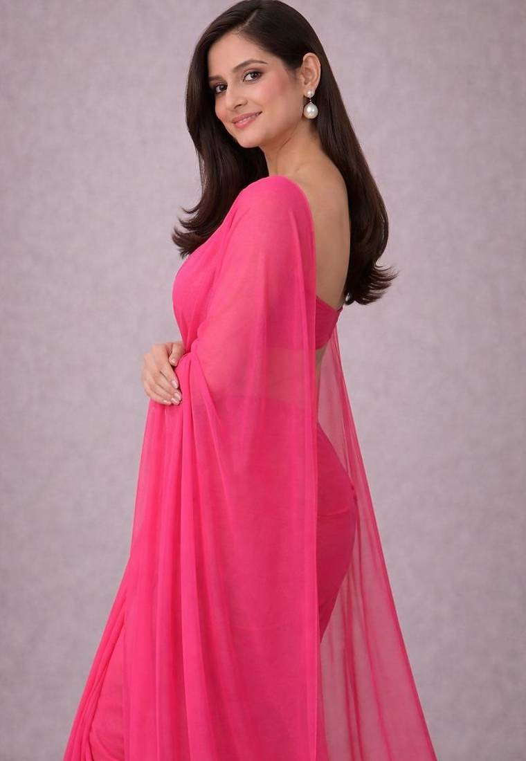 Hot pink color plain georgette designer saree with blouse