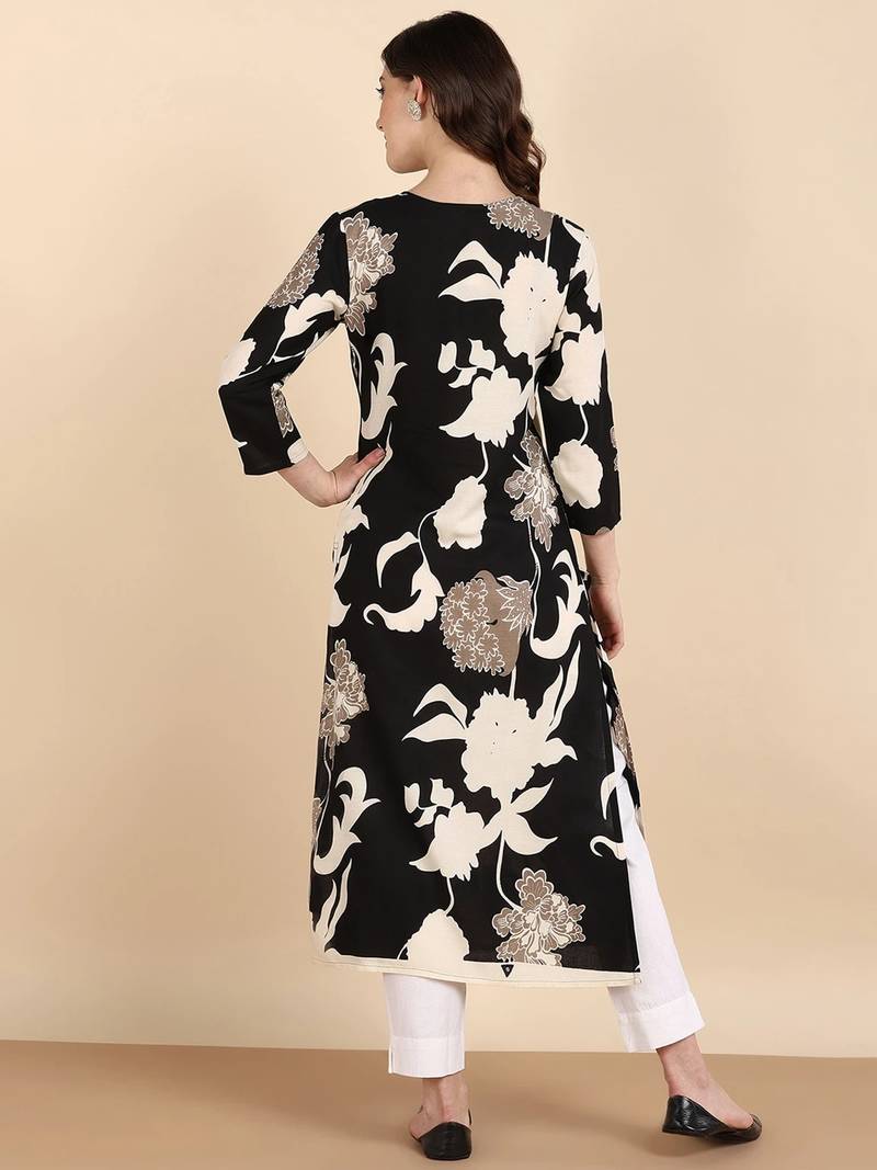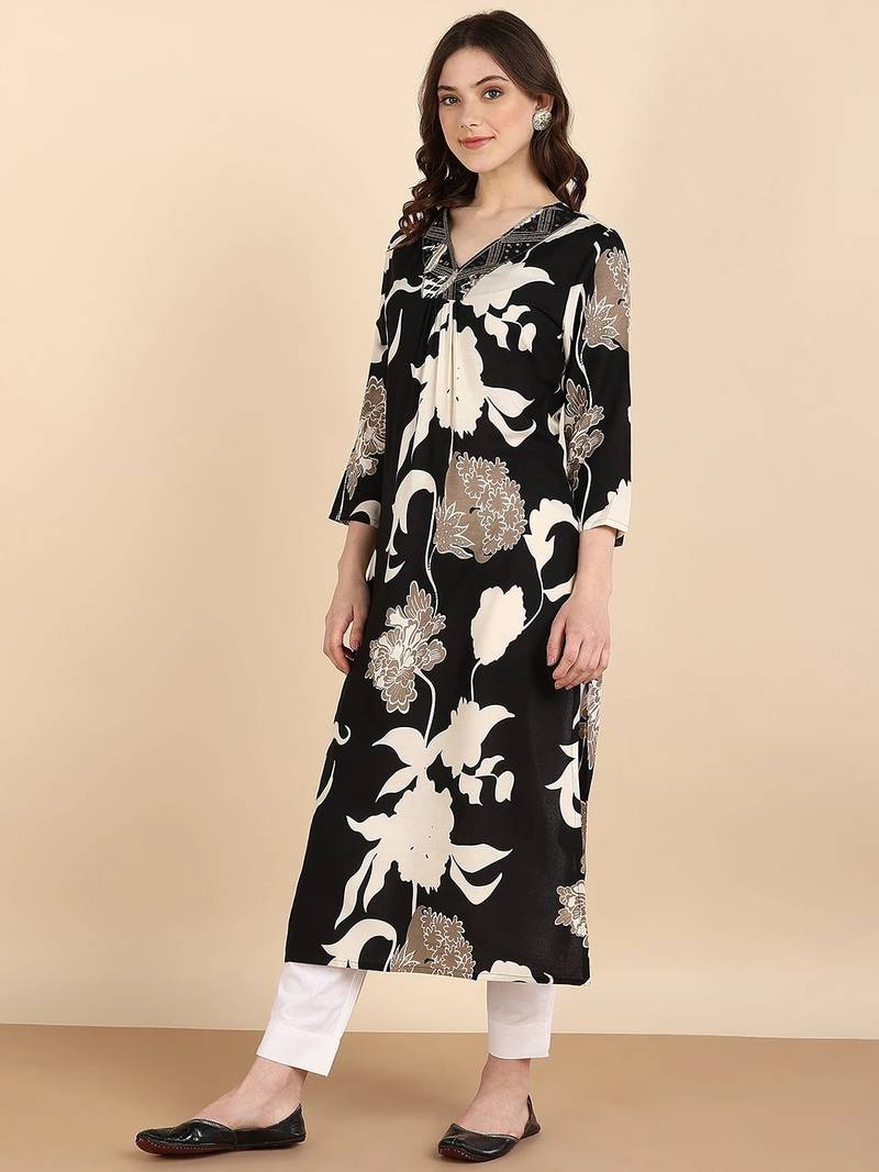 | Product Name | Women's Big Floral Printed Black Rayon A Line Kurti|Stylish V Neck 3/4 Sleeve Ethnic Long Kurta For Women & Girls | |