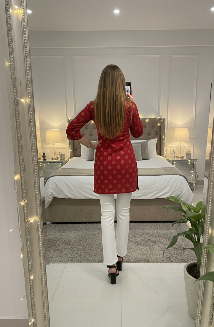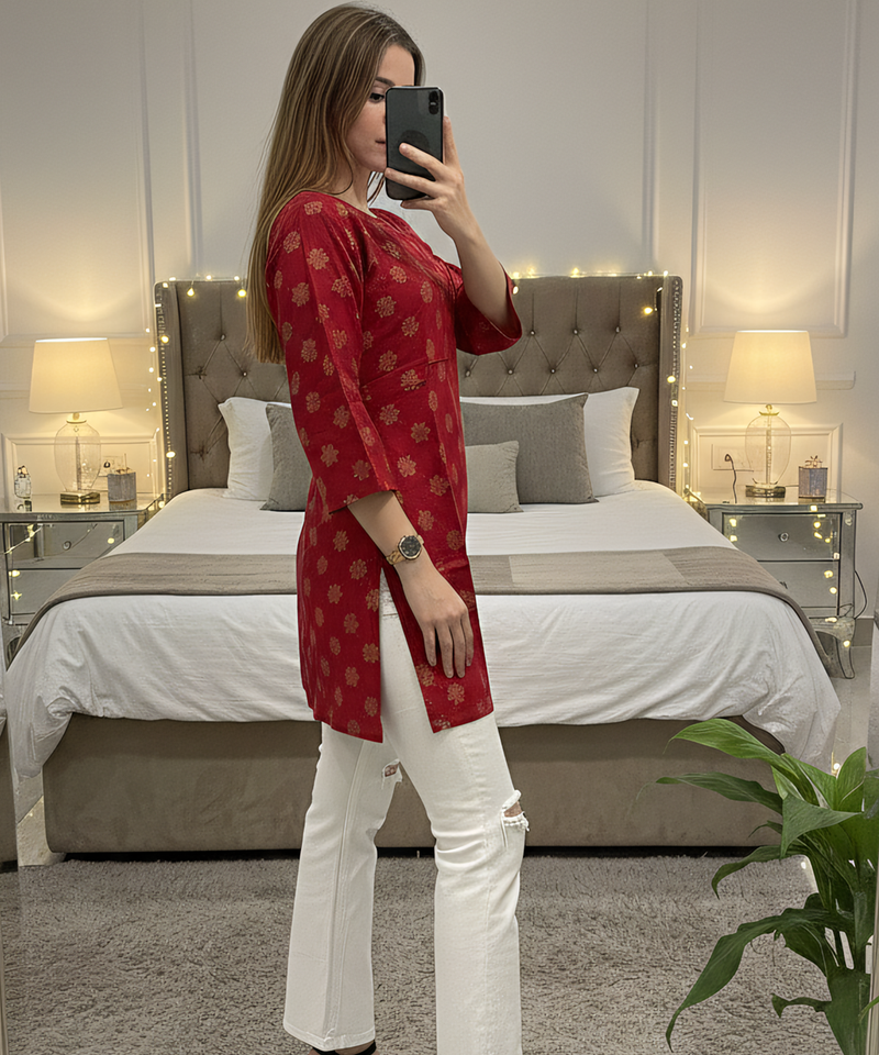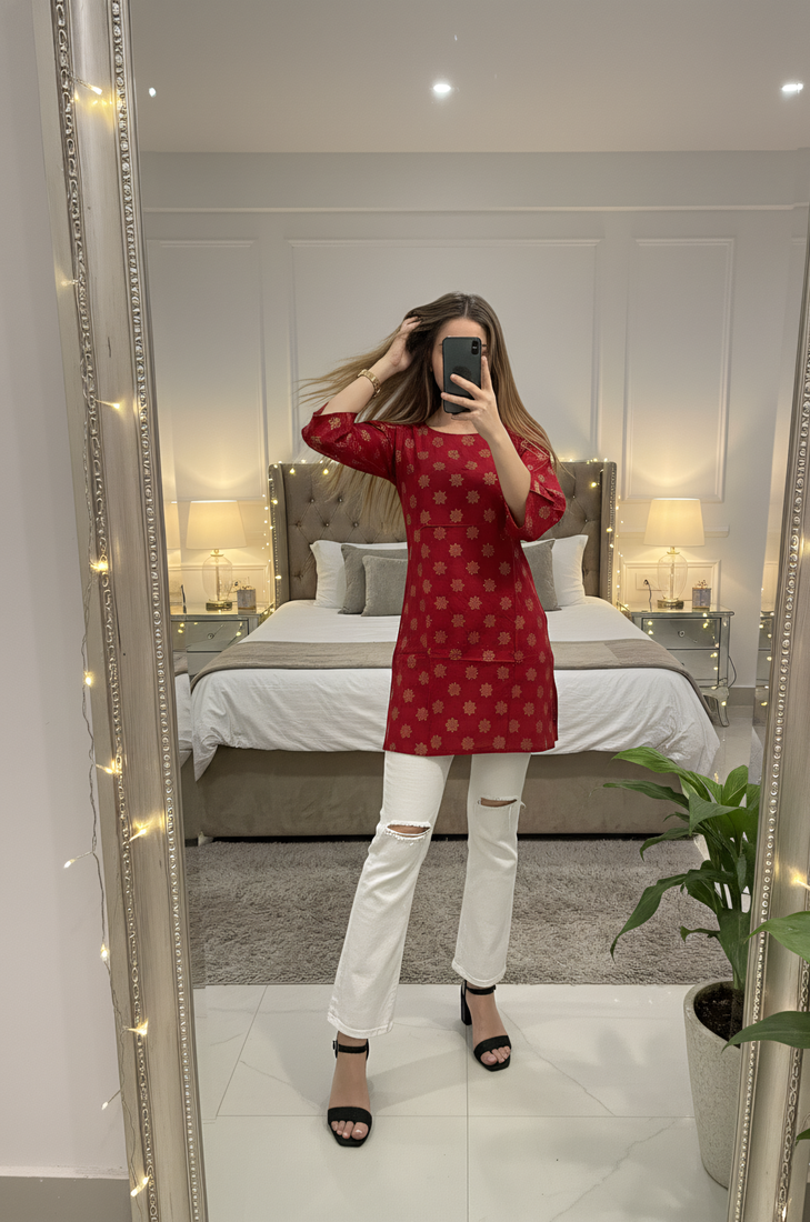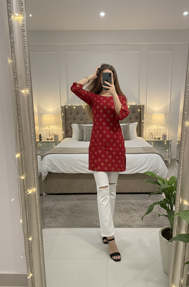 | Product Description | Elevate Your Everyday Ethnic Wardrobe With This Vibrant Red & Gold Short Kurti. Crafted From Premium Rayon Fabric, This Piece Features A Sophisticated Gold Block Print Pattern That Adds A Touch Of Elegance To Your Look. Its A Line Cut Ensures A Flattering Fit For All Body Types, Making It A Versatile Staple For Any Season. |