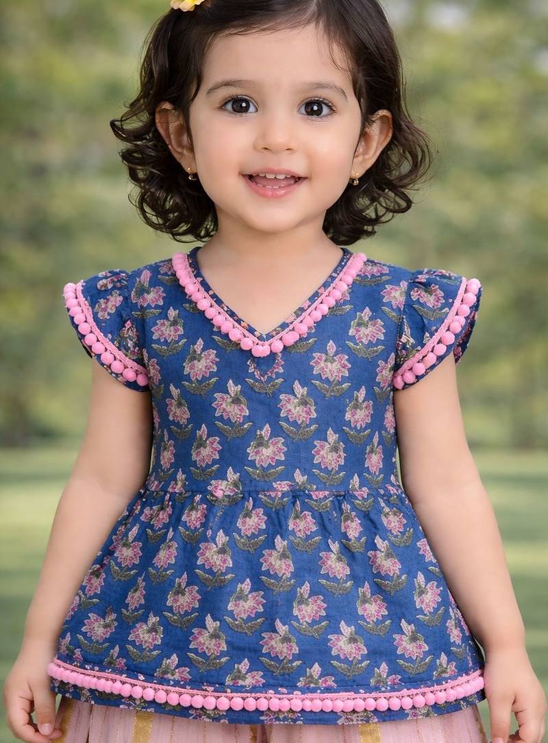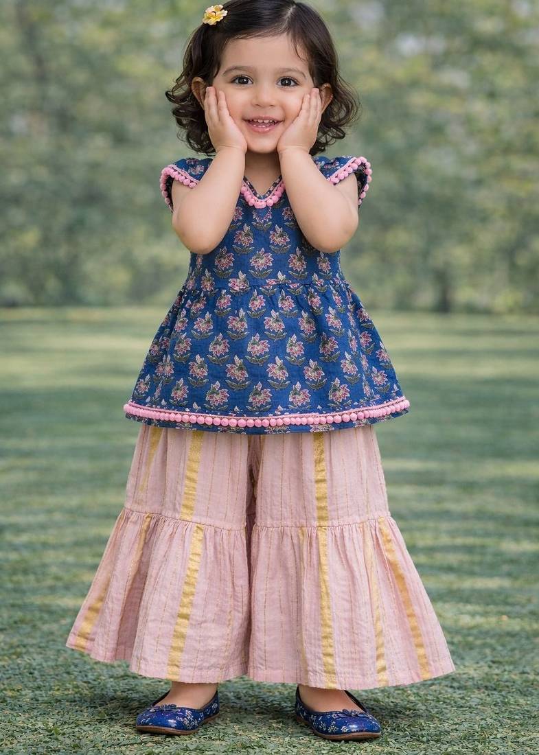 | Product Description | Baby Girl Printed Kurta Palazzo Set Made From Soft Cotton Fabric, Designed For Comfort And A Cute Ethnic Look. The Top Comes In Blue Color With Floral Print And Pom Pom Lace Detailing On The Sleeves And Hem, Which Adds A Stylish Traditional Touch. The Palazzo Comes In A Pink Color With Golden Stripe Pattern And A Loose Comfortable Fit For Easy Movement. Cotton Fabric Is Soft, Breathable, And Suitable For Long Wear. A Good Choice For Festivals, Family Functions, And Traditional Wear. Printed Kurta Palazzo Sets For Baby Girls Are Comfortable, Lightweight, And Easy To Wear For Special Occasions. |