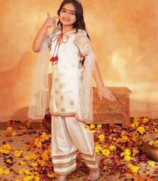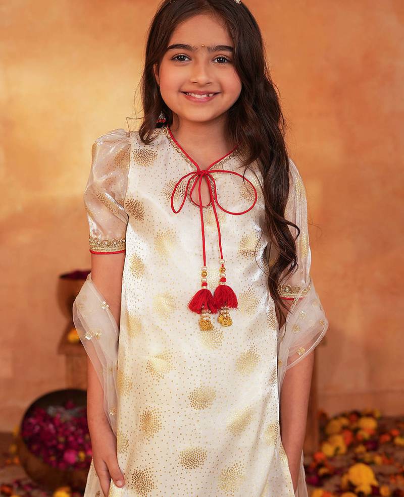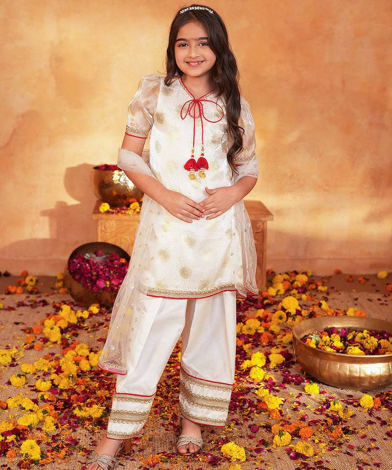 | Product Description | White Ethnic Motifs Printed Regular Kurta Paired With Patiala And Dupatta, Made From Organza Fabric For A Light And Festive Look. The Kurta Features Printed Ethnic Motifs With Thread Work Detailing And Tassel Tie Up On The Neckline, Adding A Traditional Touch To The Outfit. The Borders Have Neat Lace And Gotta Detailing Which Enhances The Overall Design. The Patiala Comes In A Comfortable Fit With Matching Border Detailing That Completes The Full Traditional Look. The Soft Organza Dupatta With Border Work Adds A Graceful Finish To The Outfit. Suitable For Festivals, Family Functions, Traditional Events, And Celebrations. A Good Choice For Girls Who Like Kurta Patiala Sets With Dupatta In Organza Fabric With Ethnic Motifs And Thread Work. |