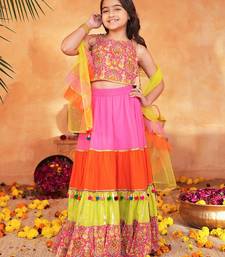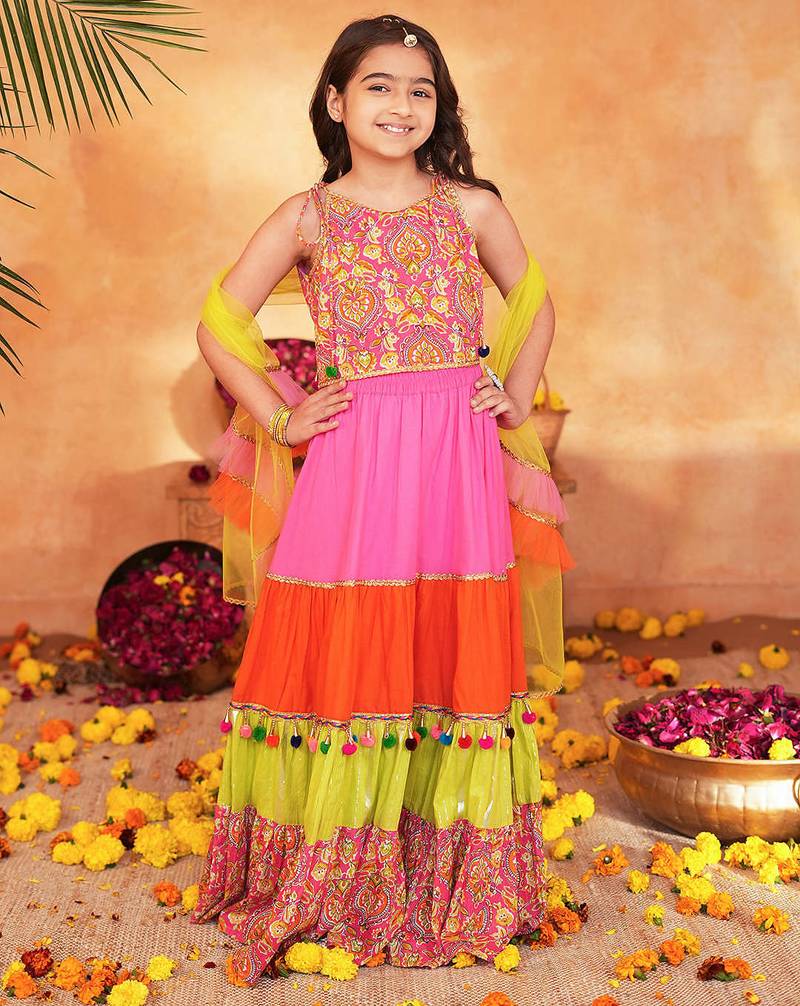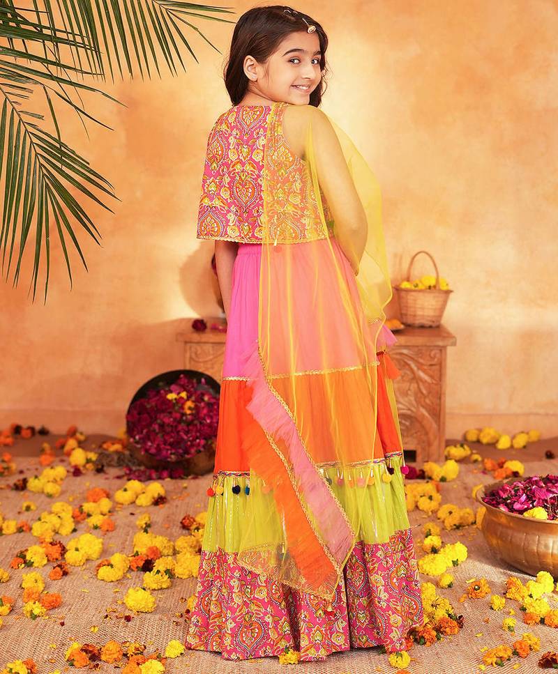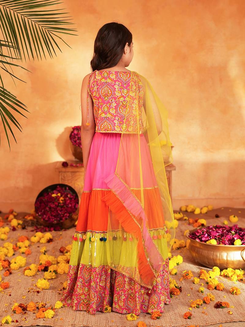 | Product Description | Pink Lehenga Choli With Dupatta Set For Girls Made From Cotton Fabric, Designed For A Bright And Colorful Traditional Look. The Choli Features Printed Design With Sleeveless Pattern And Comfortable Fit, Giving A Stylish Ethnic Touch. The Lehenga Comes With Layered Flare In Pink, Orange, And Green Color Combination With Tassel Detailing That Enhances The Overall Festive Look. The Cotton Fabric Makes The Outfit Soft, Breathable, And Comfortable For Long Wear. The Net Dupatta With Border Detailing Completes The Full Ethnic Outfit And Adds A Graceful Finish. Suitable For Festivals, Family Functions, Traditional Events, And Celebrations. A Good Choice For Girls Who Like Lehenga Choli Sets With Dupatta In Comfortable Cotton Fabric With Bright Festive Colors. |