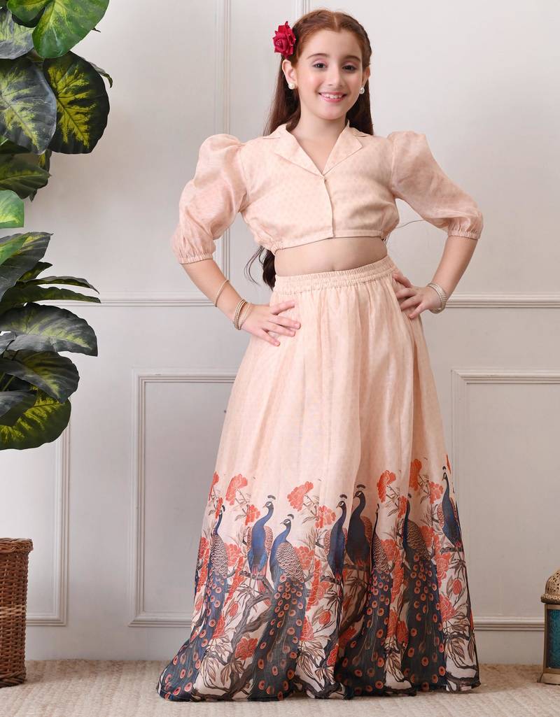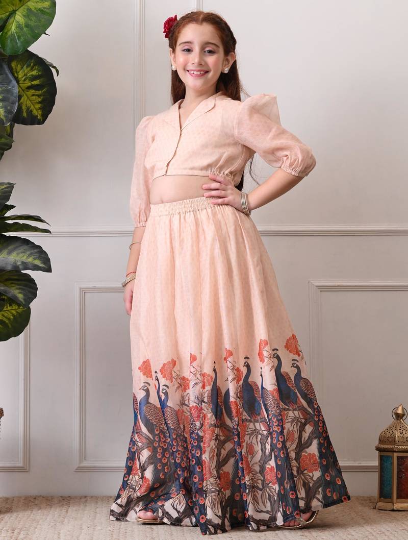 Girls peach peacock print lehenga set with puff sleeve blouse
