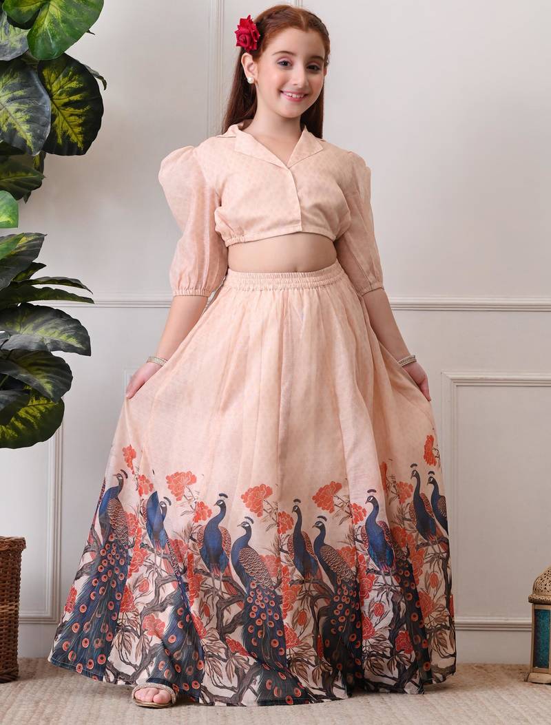 | Product Name | Girls Peach Peacock Print Lehenga Set With Puff Sleeve Blouse | |