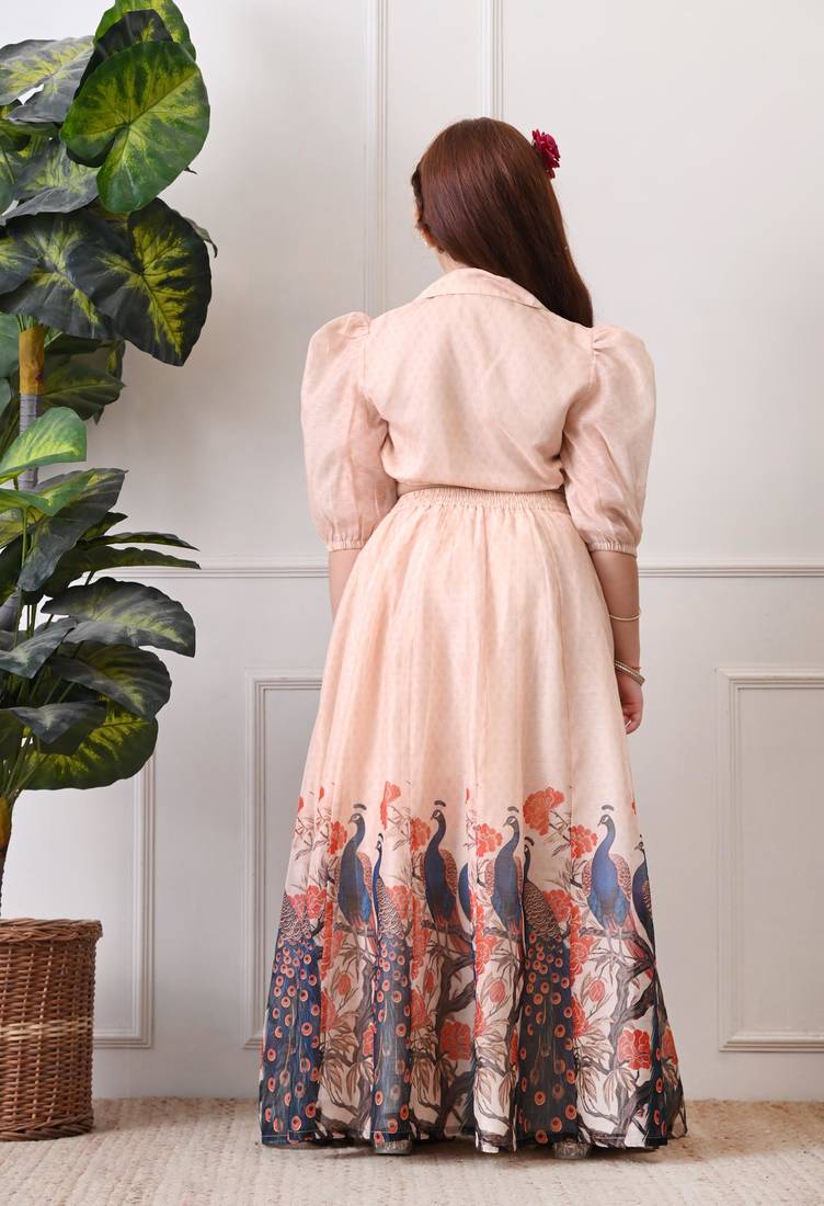 | Product Description | Peach Peacock Print Lehenga Set With Puff Sleeve Blouse. The Outfit Features A Collared Puff Sleeve Blouse Crafted From Soft, Lightweight Fabric For A Modern Yet Ethnic Appeal. Paired With A Flared Lehenga Skirt Showcasing A Stunning Digital Peacock And Floral Border Print, This Ensemble Blends Tradition With Style Effortlessly. |