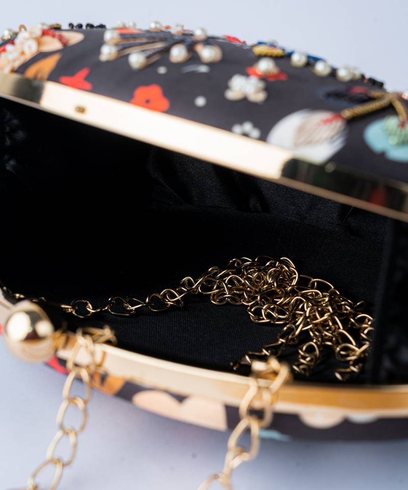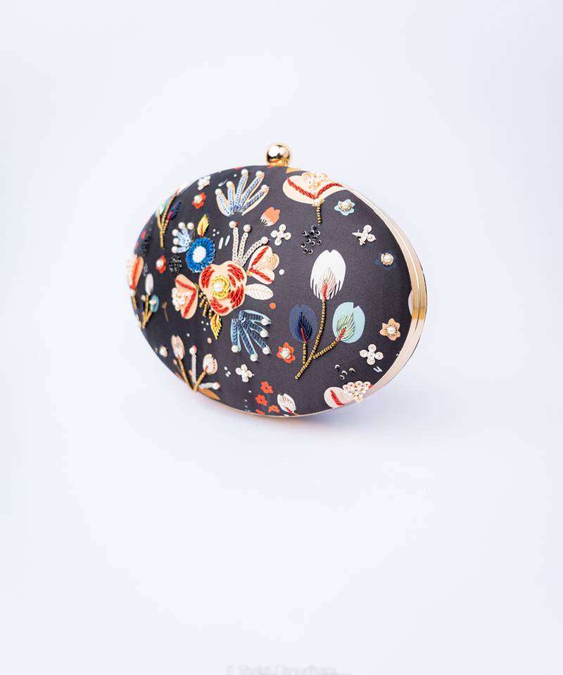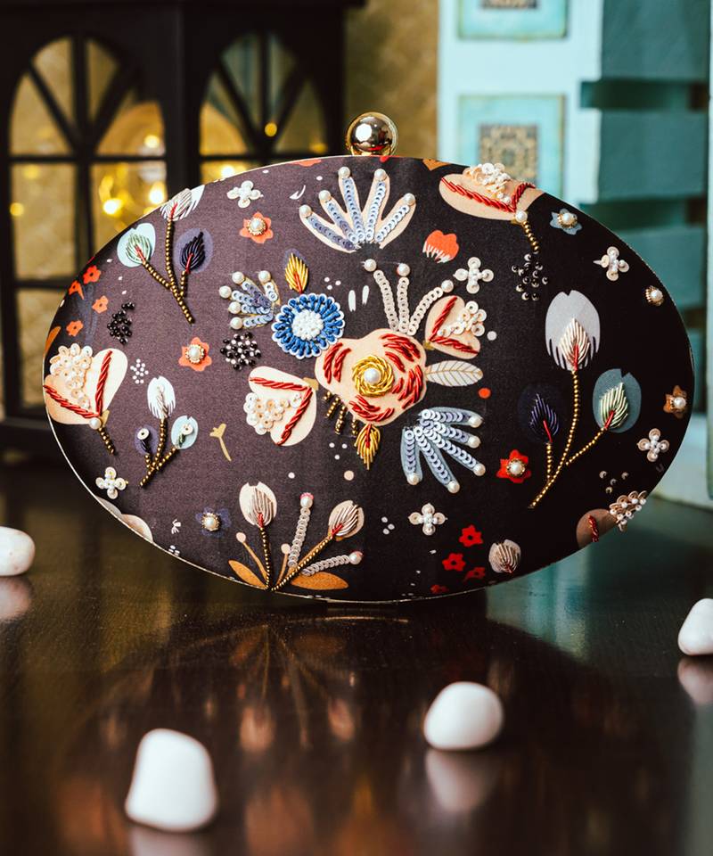 | Product Description | Features Intricate Embroidery In Black For A Timeless And Versatile Look. Oval Shaped Box Silhouette Offers A Unique, Structured Appeal. Includes One Main Compartment Secured With A Twist Closure For Safe Access. Comes With A Shoulder Strap For Hands Free Styling And Flexible Wear. A Refined Clutch Perfect For Formal Gatherings, Festive Occasions, Or Everyday Elegance. |