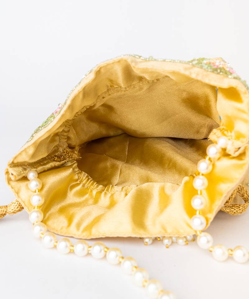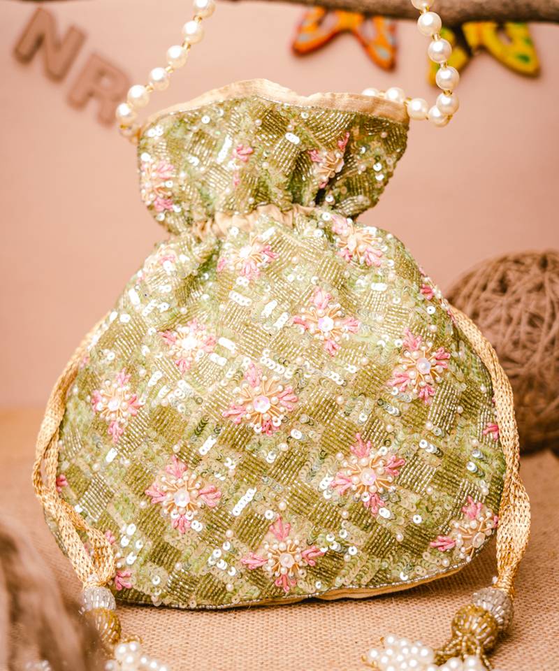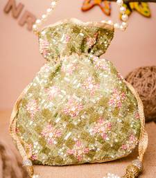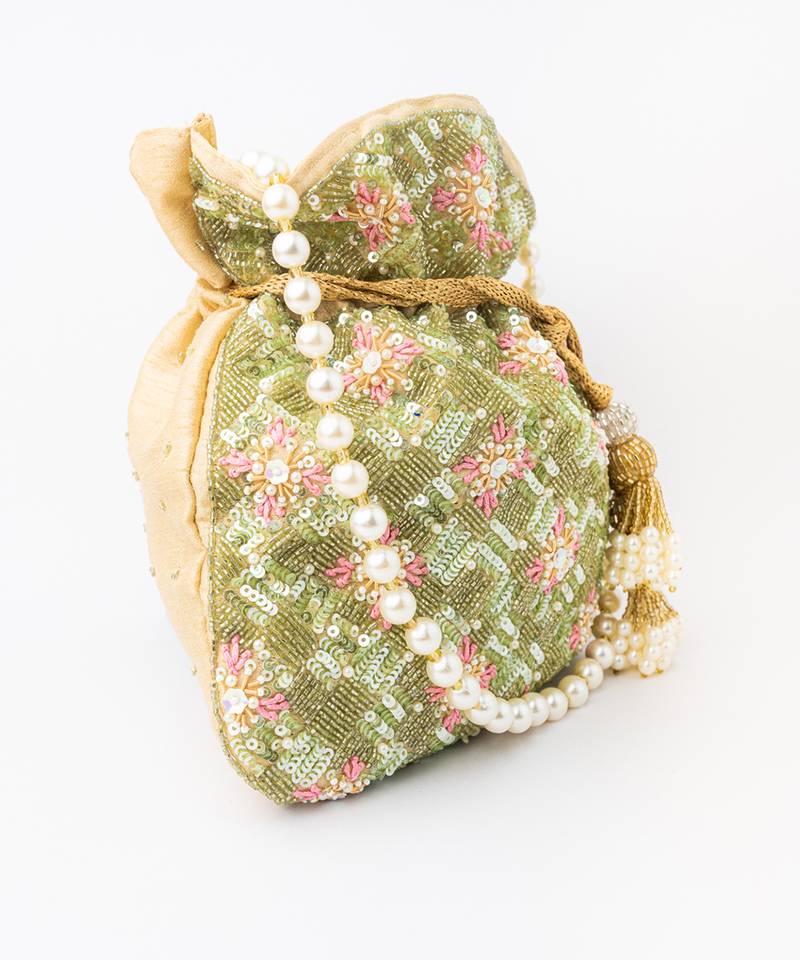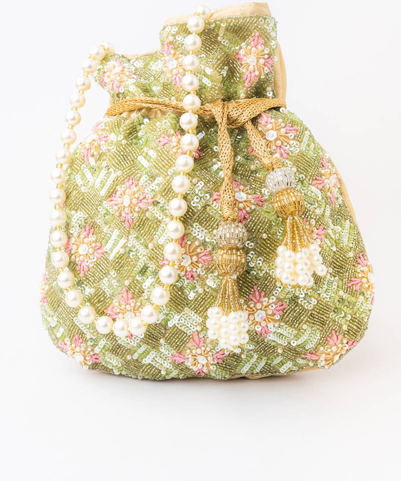 | Product Description | Embroidered In Crisp White With Intricate Green Threadwork For A Vibrant Ethnic Touch. Classic Potli Silhouette With Drawstring Closure Adds Charm And Secure Storage. Includes One Main Compartment Ideal For Carrying Small Festive Essentials. Comes With A Wrist Loop For Graceful Handheld Styling And Ease Of Use. A Timeless Piece Perfect For Traditional Events, Weddings, And Cultural Celebrations. |