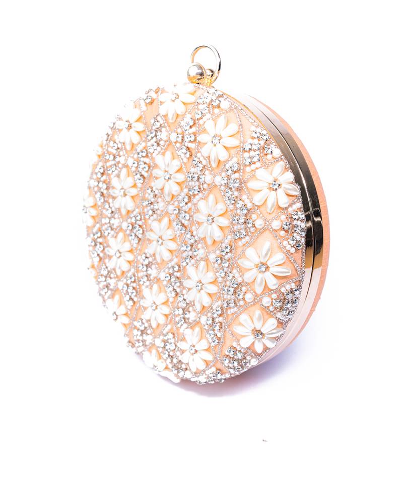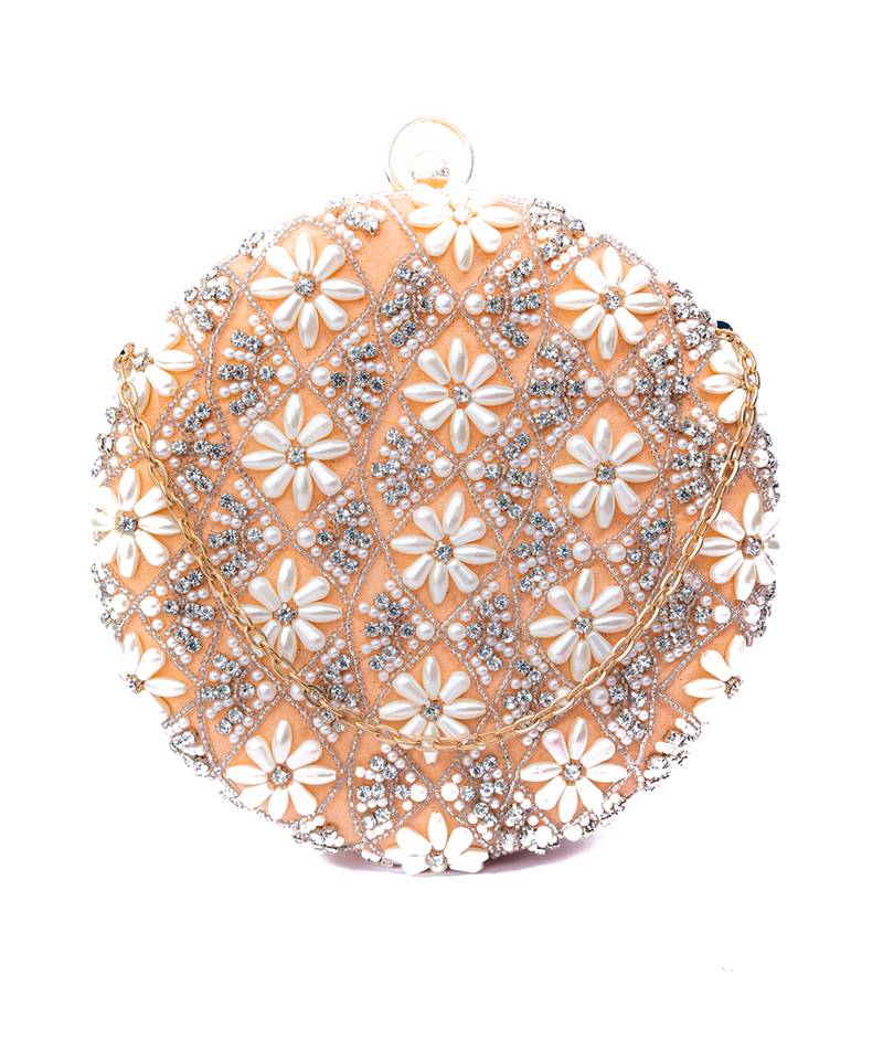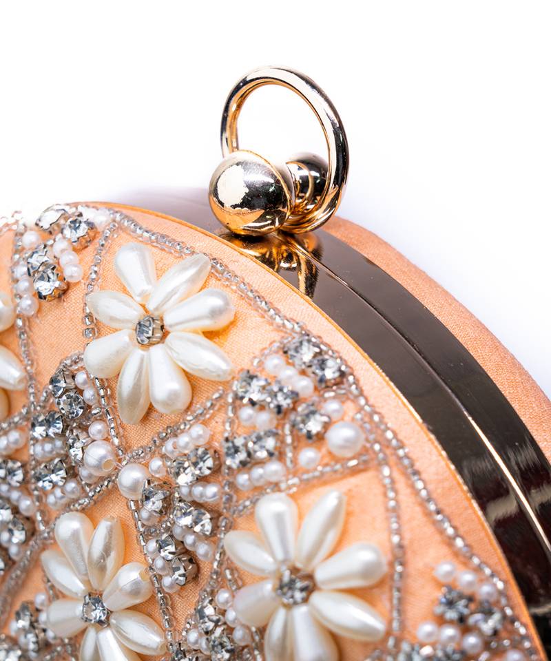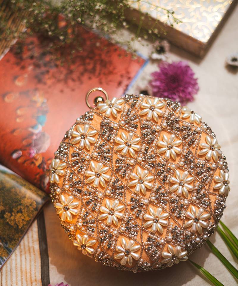 | Product Description | Embroidered In Soft Peach Tones For A Graceful And Festive Look. Unique Round Box Silhouette Offers A Blend Of Modern Flair And Ethnic Elegance. Includes One Main Compartment Secured With A Twist Closure For Safe Storage. Comes With A Shoulder Strap For Hands Free Convenience And Elevated Style. A Refined Accessory Ideal For Weddings, Celebrations, Or Ethnic Ensembles With Subtle Sophistication. |