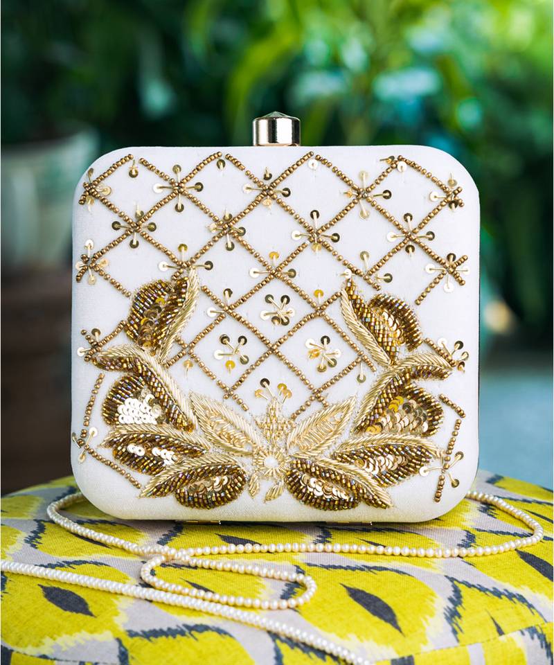 | Product Description | Embroidered In Classic White And Gold Tones For A Refined And Festive Aesthetic. Structured Box Silhouette Brings Modern Flair To Traditional Styling. Includes One Main Compartment Secured With A Twist Closure For Safe And Convenient Storage. Comes With A Shoulder Strap For Hands Free Comfort And Easy Portability. A Graceful Accessory Ideal For Weddings, Receptions, Or Cultural Celebrations... |