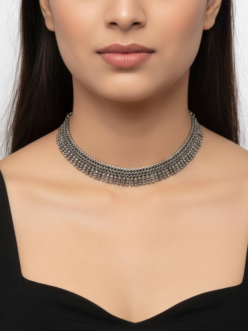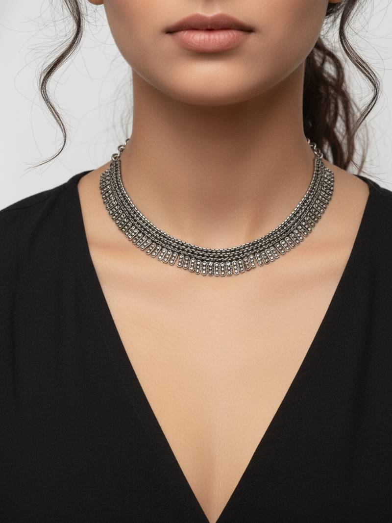 This Item Is An Nvr Women Antique Look Layered Ethnic Necklace For Women For Girls And Women Featuring A Striking Design Of Cascading Teardrop Or Spike Shaped Charms. The Main Body Of The Necklace Is Composed Of Multiple Rows Of Small, Round Metal Beads, Creating A Rich, Layered Effect. Features A Prominent Choker Style With A Fringe Of Pointed, Teardrop, Spike Charms Dangling Along The Bottom Edge, Which Adds Movement And A Unique Aesthetic. Perfect For Those Who Love Ethnic, Tribal, Or Indo Western Statement Jewelry, Suitable For Pairing With Sarees, Lehengas, Or Modern Deep Neck Outfits.