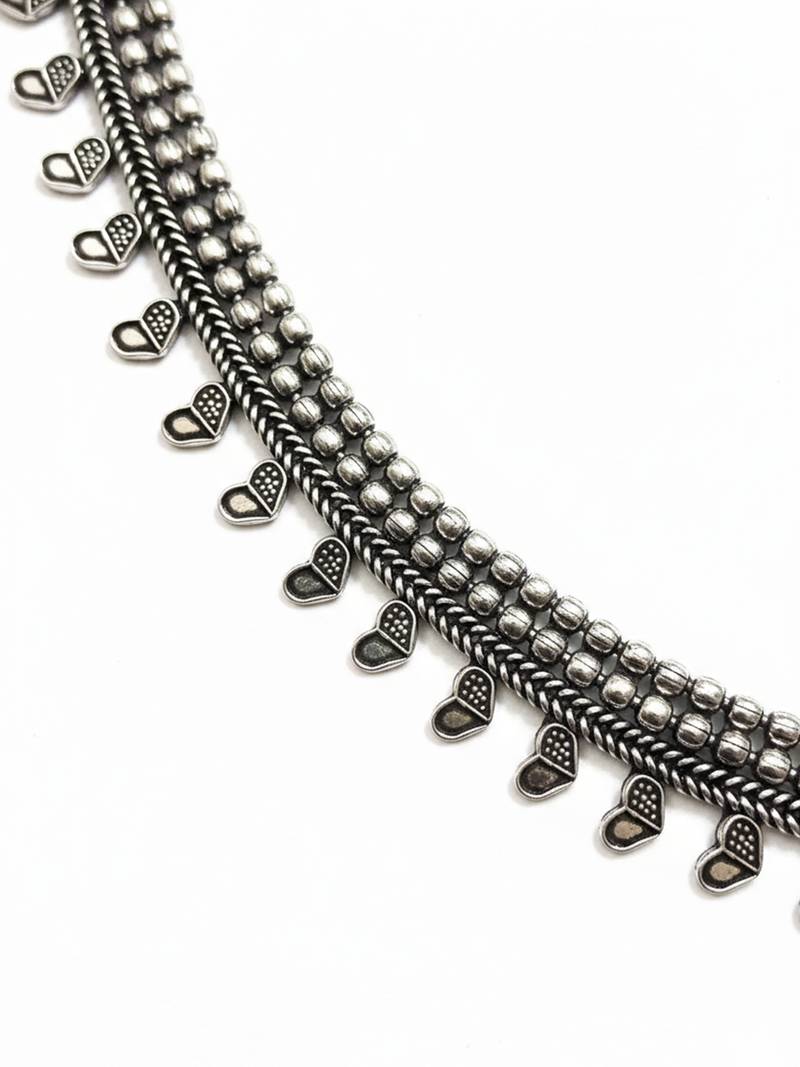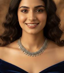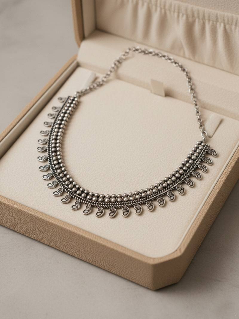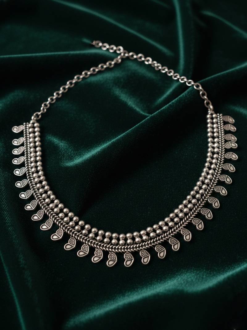 This Item Is An Nvr Women German Oxidized Silver Leaf Choker Necklace For Girls And Women Featuring A Striking Design Of Cascading Teardrop Or Spike Shaped Charms. The Main Body Of The Necklace Is Composed Of Multiple Rows Of Small, Round Metal Beads, Creating A Rich, Layered Effect. Features A Prominent Choker Style With A Fringe Of Pointed, Teardrop, Spike Charms Dangling Along The Bottom Edge, Which Adds Movement And A Unique Aesthetic. Perfect For Those Who Love Ethnic, Tribal, Or Indo Western Statement Jewelry, Suitable For Pairing With Sarees, Lehengas, Or Modern Deep Neck Outfits.