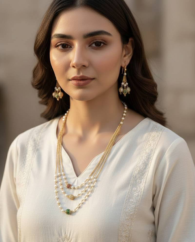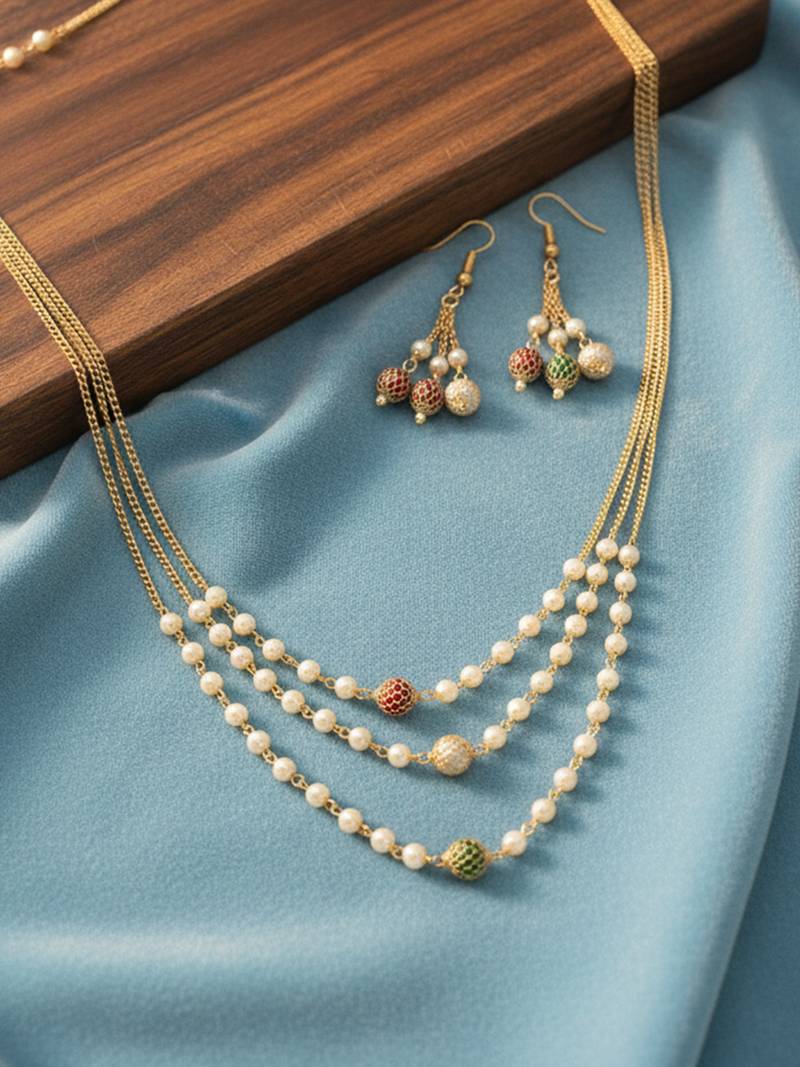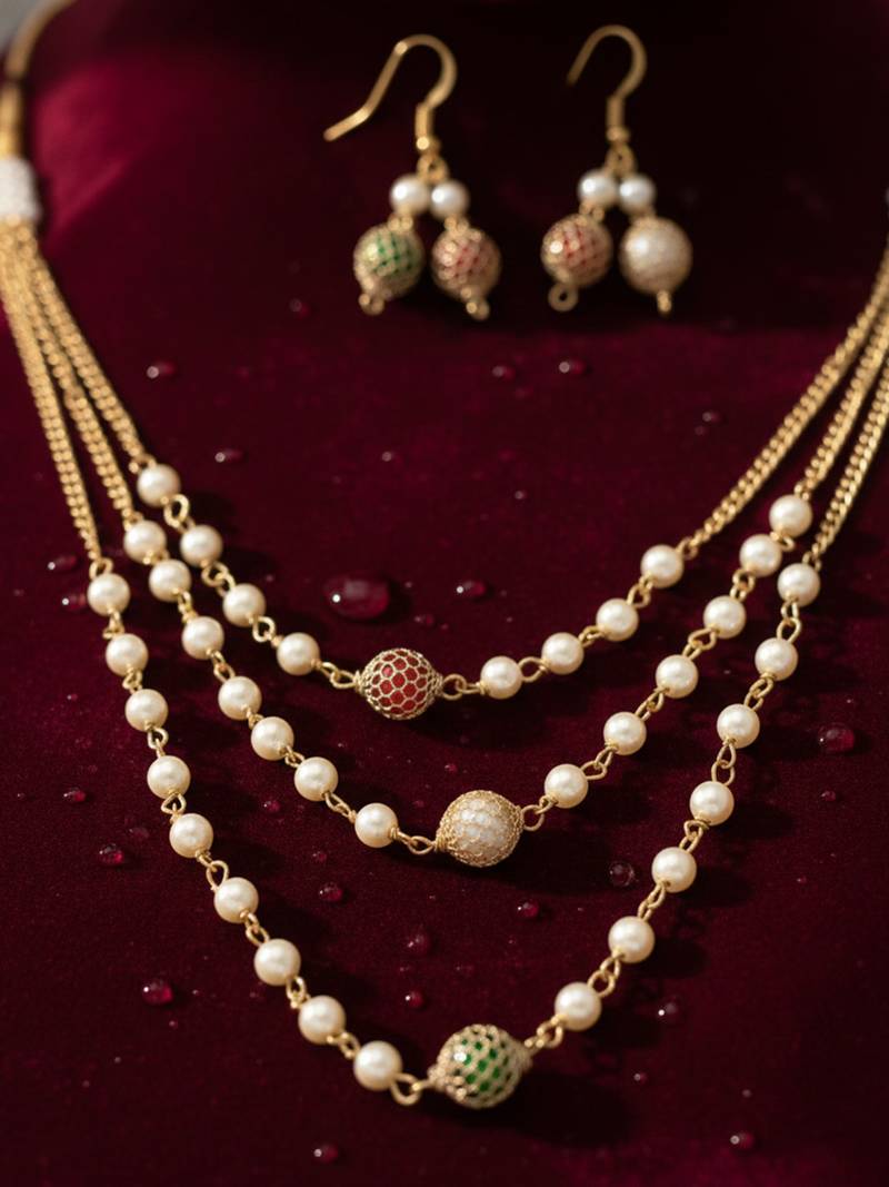 | Product Description | Women Gold Plated Multicolour Artificial Beads Necklace With Earrings Elegant And Vibrant, This Women’s Jewellery Set Features A Stunning Layered Gold Tone Necklace Paired With Matching Drop Earrings. The Necklace Showcases Multiple Delicate Strands Adorned With Luminous Pearls And Subtle Multicolor Bead Accents, Creating A Graceful Blend Of Classic And Contemporary Style. The Coordinating Earrings Mirror The Colorful Bead Details, Adding Charm And Balance To The Overall Look. Perfect For Festive Occasions, Weddings, Or Special Celebrations, This Set Adds Sophistication And A Touch Of Playful Color To Any Outfit. |