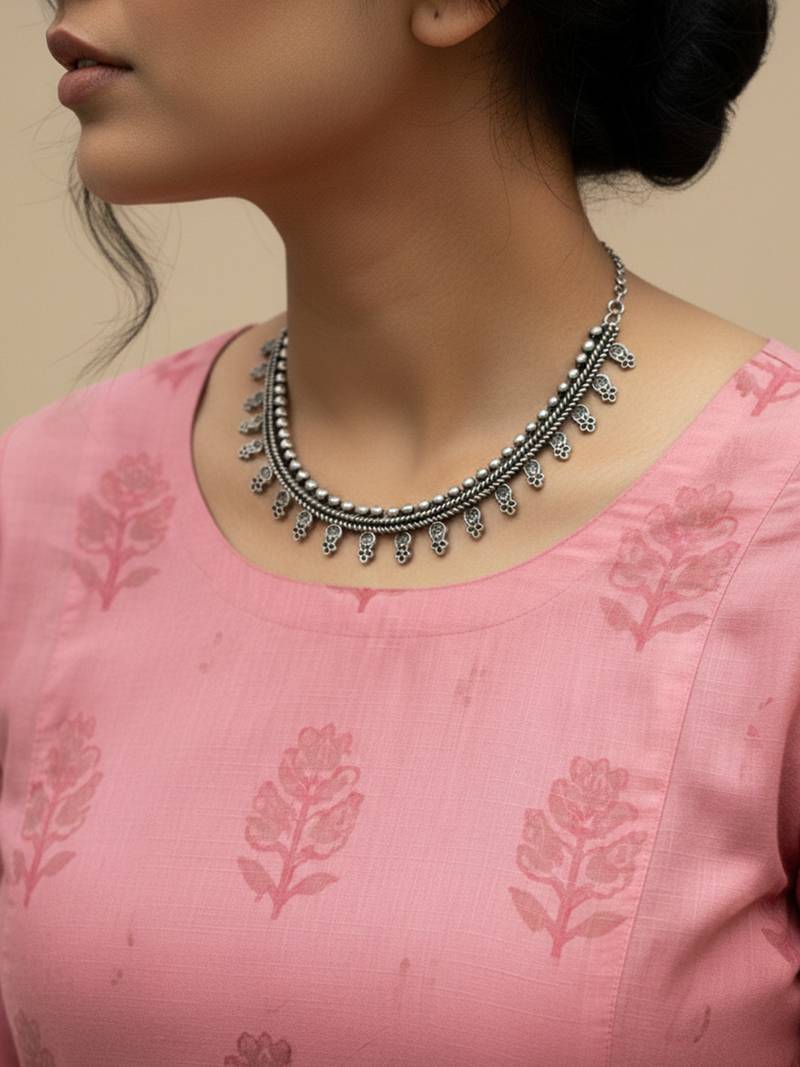 | Product Description | This Item Is An Nvr Women Oxidised Silver Choker Necklace With Paisley Drops For Girls And Women Featuring A Striking Design Of Cascading Teardrop Or Spike Shaped Charms. The Main Body Of The Necklace Is Composed Of Multiple Rows Of Small, Round Metal Beads, Creating A Rich, Layered Effect. Features A Prominent Choker Style With A Fringe Of Pointed, Teardrop, Spike Charms Dangling Along The Bottom Edge, Which Adds Movement And A Unique Aesthetic. Perfect For Those Who Love Ethnic, Tribal, Or Indo Western Statement Jewelry, Suitable For Pairing With Sarees, Lehengas, Or Modern Deep Neck Outfits. |